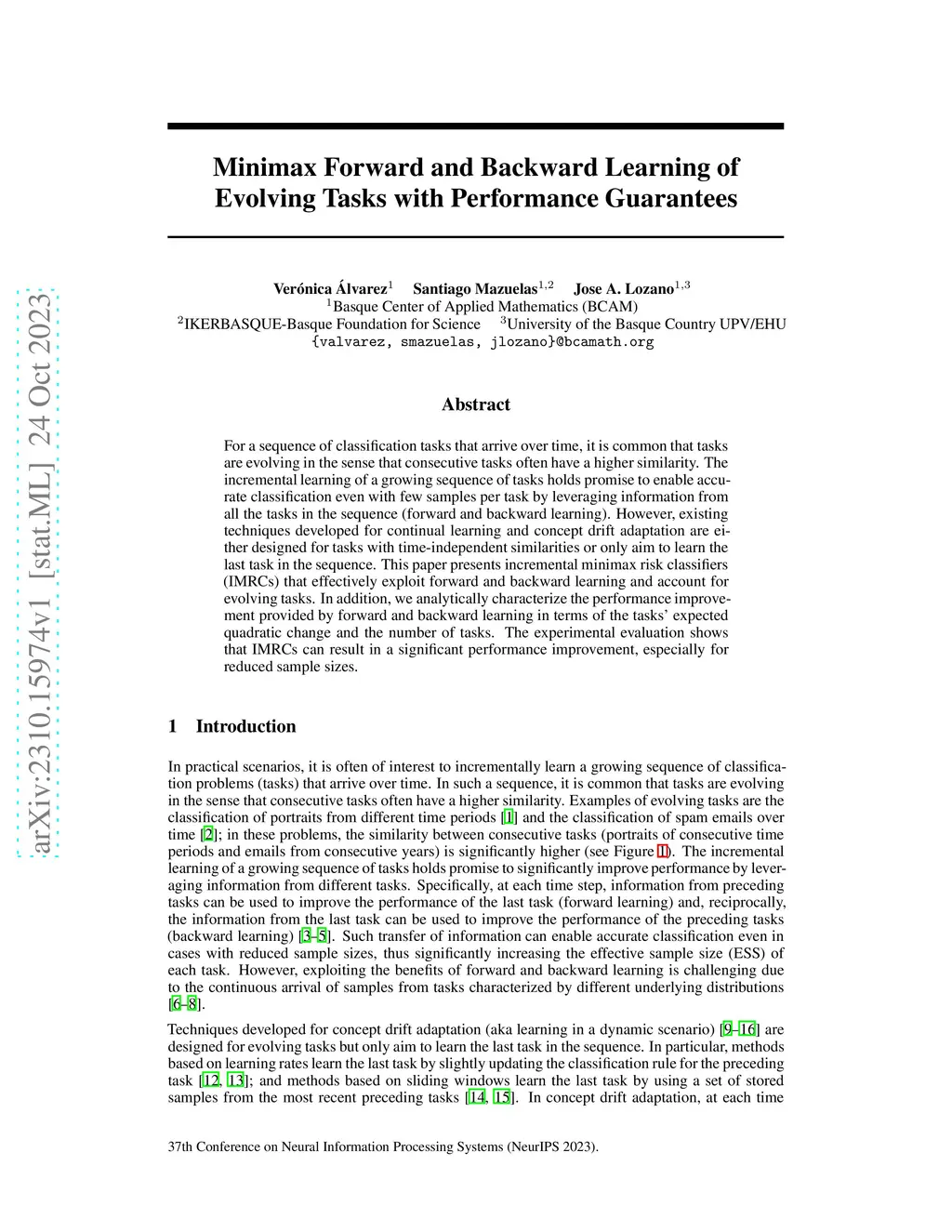 For a sequence of classification tasks that arrive over time, it is common that tasks are evolving in the sense that consecutive tasks often have a higher similarity. The incremental learning of a growing sequence of tasks holds promise to enable accurate classification even with few samples per task by leveraging information from all the tasks in the sequence (forward and backward learning). However, existing techniques developed for continual learning and concept drift adaptation are either designed for tasks with time-independent similarities or only aim to learn the last task in the sequence. This paper presents incremental minimax risk classifiers (IMRCs) that effectively exploit forward and backward learning and account for evolving tasks. In addition, we analytically characterize the performance improvement provided by forward and backward learning in terms of the tasks' expected quadratic change and the number of tasks. The experimental evaluation shows that IMRCs can result in a significant performance improvement, especially for reduced sample sizes.