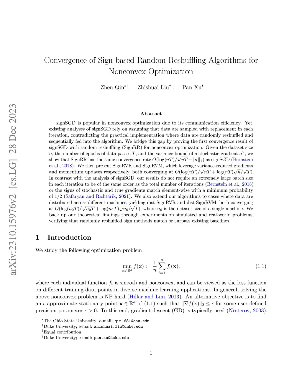 signSGD is popular in nonconvex optimization due to its communication efficiency. Yet, existing analyses of signSGD rely on assuming that data are sampled with replacement in each iteration, contradicting the practical implementation where data are randomly reshuffled and sequentially fed into the algorithm. We bridge this gap by proving the first convergence result of signSGD with random reshuffling (SignRR) for nonconvex optimization. Given the dataset size , the number of epochs of data passes , and the variance bound of a stochastic gradient , we show that SignRR has the same convergence rate as signSGD \citep{bernstein2018signsgd}. We then present SignRVR and SignRVM, which leverage variance-reduced gradients and momentum updates respectively, both converging at . In contrast with the analysis of signSGD, our results do not require an extremely large batch size in each iteration to be of the same order as the total number of iterations \citep{bernstein2018signsgd} or the signs of stochastic and true gradients match element-wise with a minimum probability of 1/2 \citep{safaryan2021stochastic}. We also extend our algorithms to cases where data are distributed across different machines, yielding dist-SignRVR and dist-SignRVM, both converging at , where is the dataset size of a single machine. We back up our theoretical findings through experiments on simulated and real-world problems, verifying that randomly reshuffled sign methods match or surpass existing baselines.
