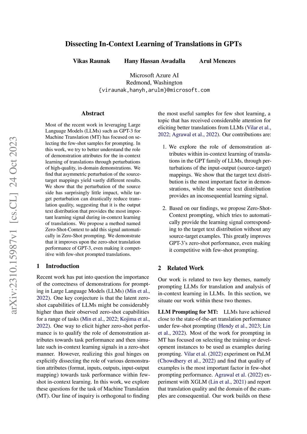 Most of the recent work in leveraging Large Language Models (LLMs) such as GPT-3 for Machine Translation (MT) has focused on selecting the few-shot samples for prompting. In this work, we try to better understand the role of demonstration attributes for the in-context learning of translations through perturbations of high-quality, in-domain demonstrations. We find that asymmetric perturbation of the source-target mappings yield vastly different results. We show that the perturbation of the source side has surprisingly little impact, while target perturbation can drastically reduce translation quality, suggesting that it is the output text distribution that provides the most important learning signal during in-context learning of translations. We propose a method named Zero-Shot-Context to add this signal automatically in Zero-Shot prompting. We demonstrate that it improves upon the zero-shot translation performance of GPT-3, even making it competitive with few-shot prompted translations.