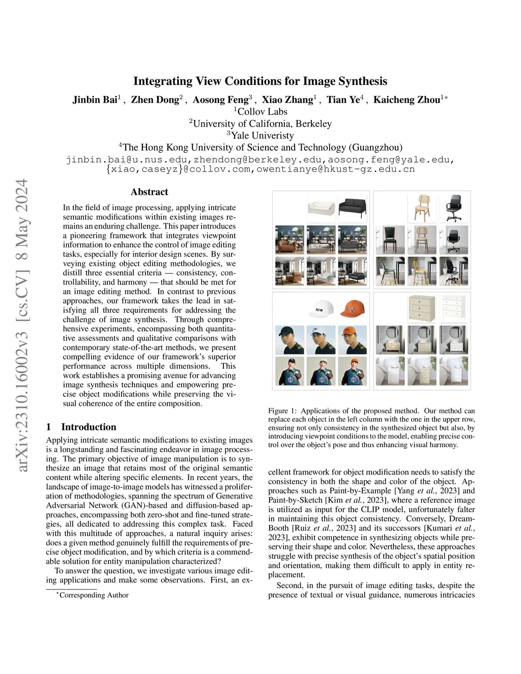 In the field of image processing, applying intricate semantic modifications within existing images remains an enduring challenge. This paper introduces a pioneering framework that integrates viewpoint information to enhance the control of image editing tasks, especially for interior design scenes. By surveying existing object editing methodologies, we distill three essential criteria -- consistency, controllability, and harmony -- that should be met for an image editing method. In contrast to previous approaches, our framework takes the lead in satisfying all three requirements for addressing the challenge of image synthesis. Through comprehensive experiments, encompassing both quantitative assessments and qualitative comparisons with contemporary state-of-the-art methods, we present compelling evidence of our framework's superior performance across multiple dimensions. This work establishes a promising avenue for advancing image synthesis techniques and empowering precise object modifications while preserving the visual coherence of the entire composition.