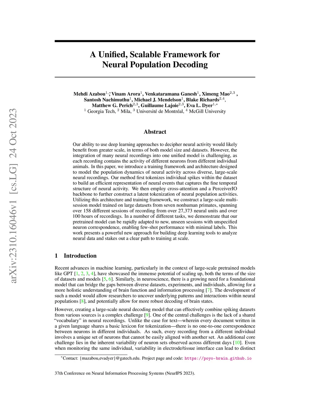 Our ability to use deep learning approaches to decipher neural activity would likely benefit from greater scale, in terms of both model size and datasets. However, the integration of many neural recordings into one unified model is challenging, as each recording contains the activity of different neurons from different individual animals. In this paper, we introduce a training framework and architecture designed to model the population dynamics of neural activity across diverse, large-scale neural recordings. Our method first tokenizes individual spikes within the dataset to build an efficient representation of neural events that captures the fine temporal structure of neural activity. We then employ cross-attention and a PerceiverIO backbone to further construct a latent tokenization of neural population activities. Utilizing this architecture and training framework, we construct a large-scale multi-session model trained on large datasets from seven nonhuman primates, spanning over 158 different sessions of recording from over 27,373 neural units and over 100 hours of recordings. In a number of different tasks, we demonstrate that our pretrained model can be rapidly adapted to new, unseen sessions with unspecified neuron correspondence, enabling few-shot performance with minimal labels. This work presents a powerful new approach for building deep learning tools to analyze neural data and stakes out a clear path to training at scale.