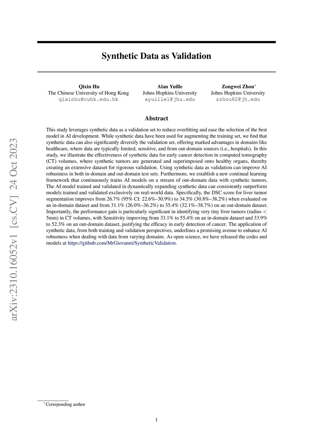 This study leverages synthetic data as a validation set to reduce overfitting and ease the selection of the best model in AI development. While synthetic data have been used for augmenting the training set, we find that synthetic data can also significantly diversify the validation set, offering marked advantages in domains like healthcare, where data are typically limited, sensitive, and from out-domain sources (i.e., hospitals). In this study, we illustrate the effectiveness of synthetic data for early cancer detection in computed tomography (CT) volumes, where synthetic tumors are generated and superimposed onto healthy organs, thereby creating an extensive dataset for rigorous validation. Using synthetic data as validation can improve AI robustness in both in-domain and out-domain test sets. Furthermore, we establish a new continual learning framework that continuously trains AI models on a stream of out-domain data with synthetic tumors. The AI model trained and validated in dynamically expanding synthetic data can consistently outperform models trained and validated exclusively on real-world data. Specifically, the DSC score for liver tumor segmentation improves from 26.7% (95% CI: 22.6%-30.9%) to 34.5% (30.8%-38.2%) when evaluated on an in-domain dataset and from 31.1% (26.0%-36.2%) to 35.4% (32.1%-38.7%) on an out-domain dataset. Importantly, the performance gain is particularly significant in identifying very tiny liver tumors (radius < 5mm) in CT volumes, with Sensitivity improving from 33.1% to 55.4% on an in-domain dataset and 33.9% to 52.3% on an out-domain dataset, justifying the efficacy in early detection of cancer. The application of synthetic data, from both training and validation perspectives, underlines a promising avenue to enhance AI robustness when dealing with data from varying domains.
