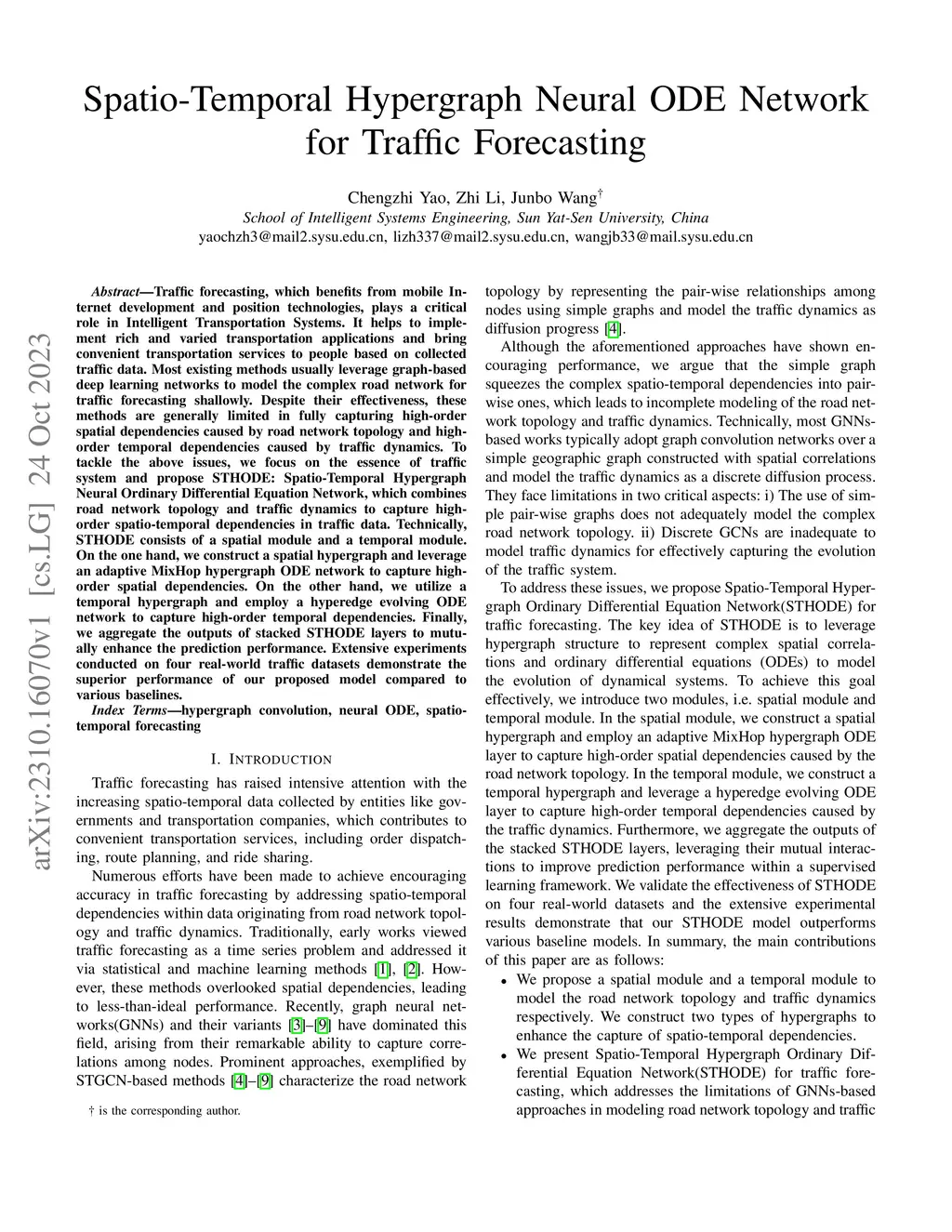 Traffic forecasting, which benefits from mobile Internet development and position technologies, plays a critical role in Intelligent Transportation Systems. It helps to implement rich and varied transportation applications and bring convenient transportation services to people based on collected traffic data. Most existing methods usually leverage graph-based deep learning networks to model the complex road network for traffic forecasting shallowly. Despite their effectiveness, these methods are generally limited in fully capturing high-order spatial dependencies caused by road network topology and high-order temporal dependencies caused by traffic dynamics. To tackle the above issues, we focus on the essence of traffic system and propose STHODE: Spatio-Temporal Hypergraph Neural Ordinary Differential Equation Network, which combines road network topology and traffic dynamics to capture high-order spatio-temporal dependencies in traffic data. Technically, STHODE consists of a spatial module and a temporal module. On the one hand, we construct a spatial hypergraph and leverage an adaptive MixHop hypergraph ODE network to capture high-order spatial dependencies. On the other hand, we utilize a temporal hypergraph and employ a hyperedge evolving ODE network to capture high-order temporal dependencies. Finally, we aggregate the outputs of stacked STHODE layers to mutually enhance the prediction performance. Extensive experiments conducted on four real-world traffic datasets demonstrate the superior performance of our proposed model compared to various baselines.