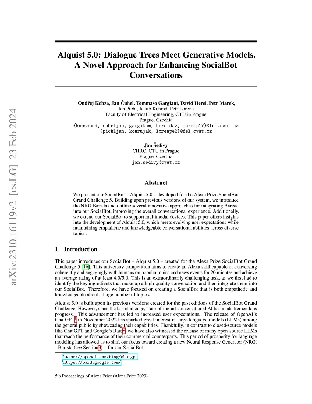 We present our SocialBot -- Alquist~5.0 -- developed for the Alexa Prize SocialBot Grand Challenge~5. Building upon previous versions of our system, we introduce the NRG Barista and outline several innovative approaches for integrating Barista into our SocialBot, improving the overall conversational experience. Additionally, we extend our SocialBot to support multimodal devices. This paper offers insights into the development of Alquist~5.0, which meets evolving user expectations while maintaining empathetic and knowledgeable conversational abilities across diverse topics.