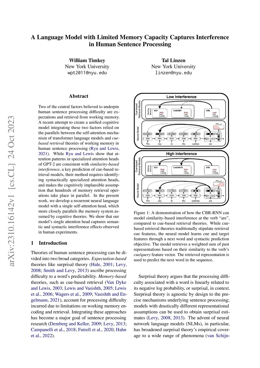 Two of the central factors believed to underpin human sentence processing difficulty are expectations and retrieval from working memory. A recent attempt to create a unified cognitive model integrating these two factors relied on the parallels between the self-attention mechanism of transformer language models and cue-based retrieval theories of working memory in human sentence processing (Ryu and Lewis 2021). While Ryu and Lewis show that attention patterns in specialized attention heads of GPT-2 are consistent with similarity-based interference, a key prediction of cue-based retrieval models, their method requires identifying syntactically specialized attention heads, and makes the cognitively implausible assumption that hundreds of memory retrieval operations take place in parallel. In the present work, we develop a recurrent neural language model with a single self-attention head, which more closely parallels the memory system assumed by cognitive theories. We show that our model's single attention head captures semantic and syntactic interference effects observed in human experiments.