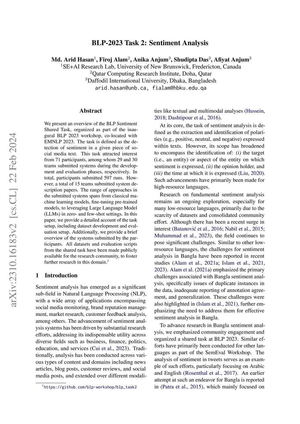 We present an overview of the BLP Sentiment Shared Task, organized as part of the inaugural BLP 2023 workshop, co-located with EMNLP 2023. The task is defined as the detection of sentiment in a given piece of social media text. This task attracted interest from 71 participants, among whom 29 and 30 teams submitted systems during the development and evaluation phases, respectively. In total, participants submitted 597 runs. However, a total of 15 teams submitted system description papers. The range of approaches in the submitted systems spans from classical machine learning models, fine-tuning pre-trained models, to leveraging Large Language Model (LLMs) in zero- and few-shot settings. In this paper, we provide a detailed account of the task setup, including dataset development and evaluation setup. Additionally, we provide a brief overview of the systems submitted by the participants. All datasets and evaluation scripts from the shared task have been made publicly available for the research community, to foster further research in this domain.
