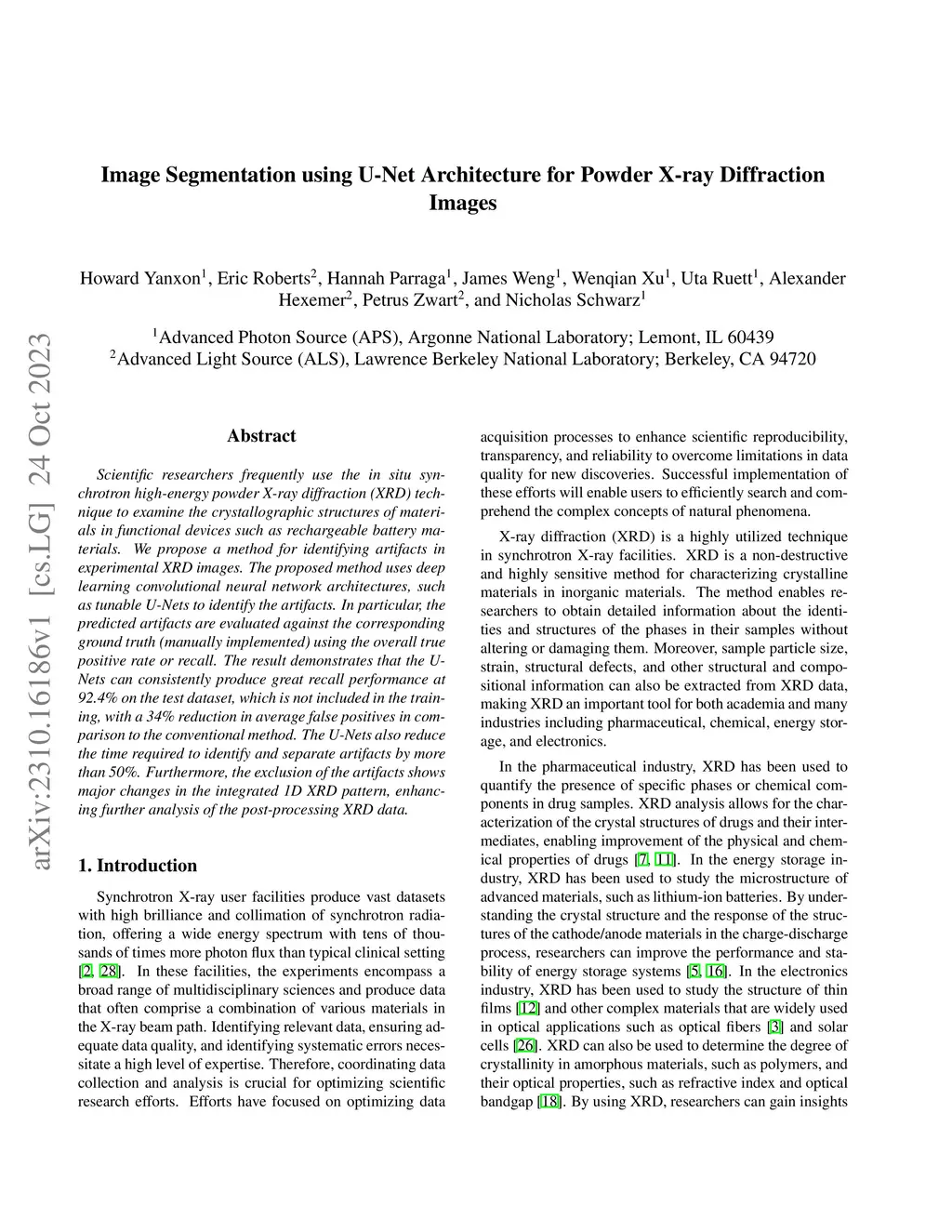Scientific researchers frequently use the in situ synchrotron high-energy powder X-ray diffraction (XRD) technique to examine the crystallographic structures of materials in functional devices such as rechargeable battery materials. We propose a method for identifying artifacts in experimental XRD images. The proposed method uses deep learning convolutional neural network architectures, such as tunable U-Nets to identify the artifacts. In particular, the predicted artifacts are evaluated against the corresponding ground truth (manually implemented) using the overall true positive rate or recall. The result demonstrates that the U-Nets can consistently produce great recall performance at 92.4% on the test dataset, which is not included in the training, with a 34% reduction in average false positives in comparison to the conventional method. The U-Nets also reduce the time required to identify and separate artifacts by more than 50%. Furthermore, the exclusion of the artifacts shows major changes in the integrated 1D XRD pattern, enhancing further analysis of the post-processing XRD data.