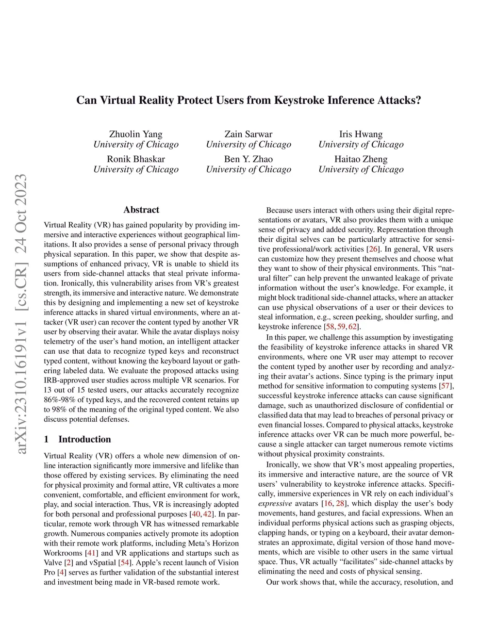 Can Virtual Reality Protect Users from Keystroke Inference Attacks?