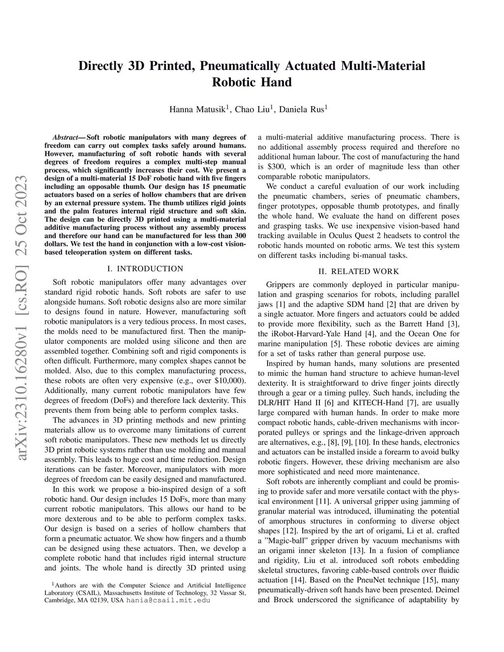 Soft robotic manipulators with many degrees of freedom can carry out complex tasks safely around humans. However, manufacturing of soft robotic hands with several degrees of freedom requires a complex multi-step manual process, which significantly increases their cost. We present a design of a multi-material 15 DoF robotic hand with five fingers including an opposable thumb. Our design has 15 pneumatic actuators based on a series of hollow chambers that are driven by an external pressure system. The thumb utilizes rigid joints and the palm features internal rigid structure and soft skin. The design can be directly 3D printed using a multi-material additive manufacturing process without any assembly process and therefore our hand can be manufactured for less than 300 dollars. We test the hand in conjunction with a low-cost vision-based teleoperation system on different tasks.