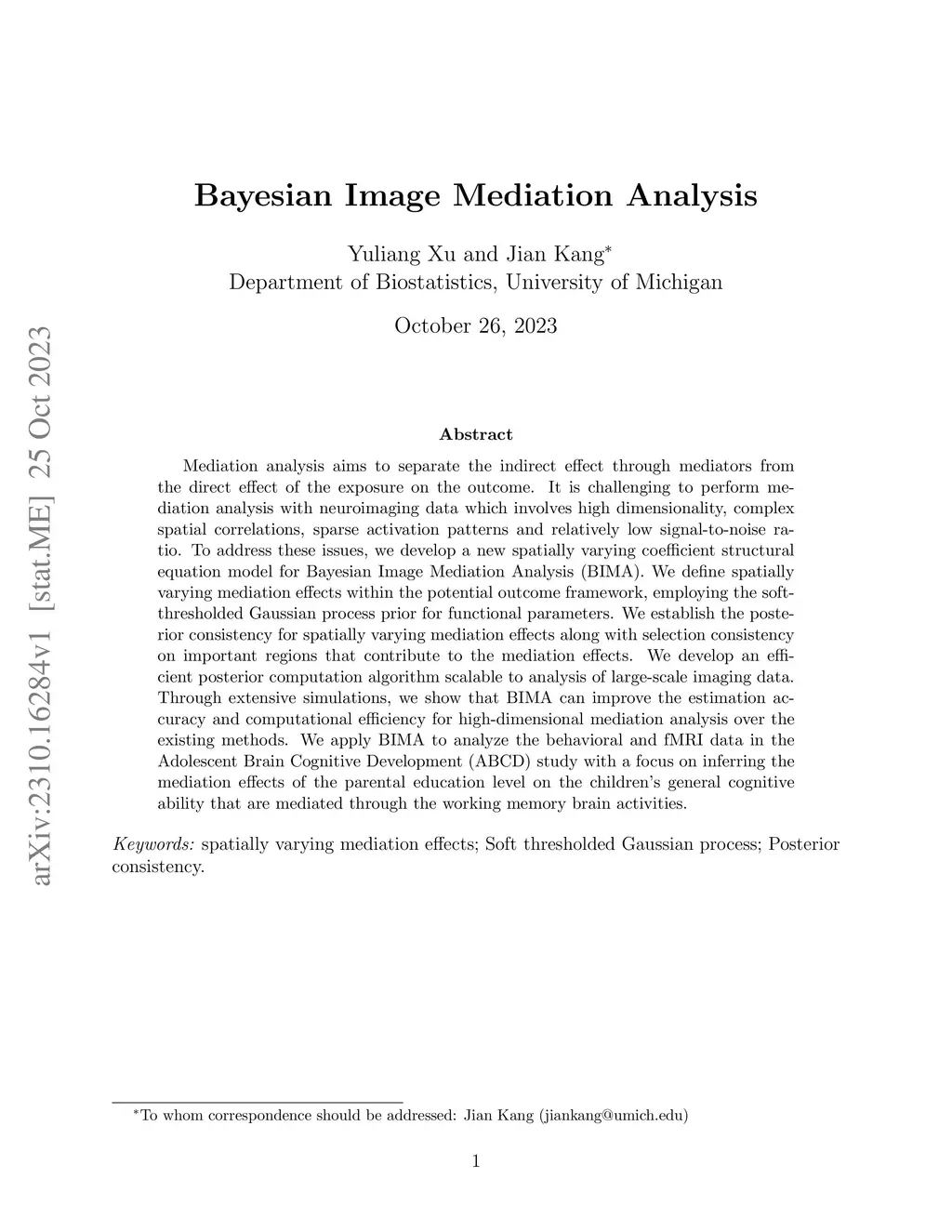 Mediation analysis aims to separate the indirect effect through mediators from the direct effect of the exposure on the outcome. It is challenging to perform mediation analysis with neuroimaging data which involves high dimensionality, complex spatial correlations, sparse activation patterns and relatively low signal-to-noise ratio. To address these issues, we develop a new spatially varying coefficient structural equation model for Bayesian Image Mediation Analysis (BIMA). We define spatially varying mediation effects within the potential outcome framework, employing the soft-thresholded Gaussian process prior for functional parameters. We establish the posterior consistency for spatially varying mediation effects along with selection consistency on important regions that contribute to the mediation effects. We develop an efficient posterior computation algorithm scalable to analysis of large-scale imaging data. Through extensive simulations, we show that BIMA can improve the estimation accuracy and computational efficiency for high-dimensional mediation analysis over the existing methods. We apply BIMA to analyze the behavioral and fMRI data in the Adolescent Brain Cognitive Development (ABCD) study with a focus on inferring the mediation effects of the parental education level on the children's general cognitive ability that are mediated through the working memory brain activities.