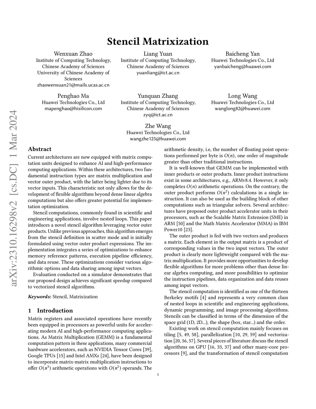 Current architectures are now equipped with matrix computation units designed to enhance AI and high-performance computing applications. Within these architectures, two fundamental instruction types are matrix multiplication and vector outer product, with the latter being lighter due to its vector inputs. This characteristic not only allows for the development of flexible algorithms beyond dense linear algebra computations but also offers greater potential for implementation optimization. Stencil computations, commonly found in scientific and engineering applications, involve nested loops. This paper introduces a novel stencil algorithm leveraging vector outer products. Unlike previous approaches, this algorithm emerges from the stencil definition in scatter mode and is initially formulated using vector outer product expressions. The implementation integrates a series of optimizations to enhance memory reference patterns, execution pipeline efficiency, and data reuse. These optimizations consider various algorithmic options and data sharing among input vectors. Evaluation conducted on a simulator demonstrates that our proposed design achieves significant speedup compared to vectorized stencil algorithms.