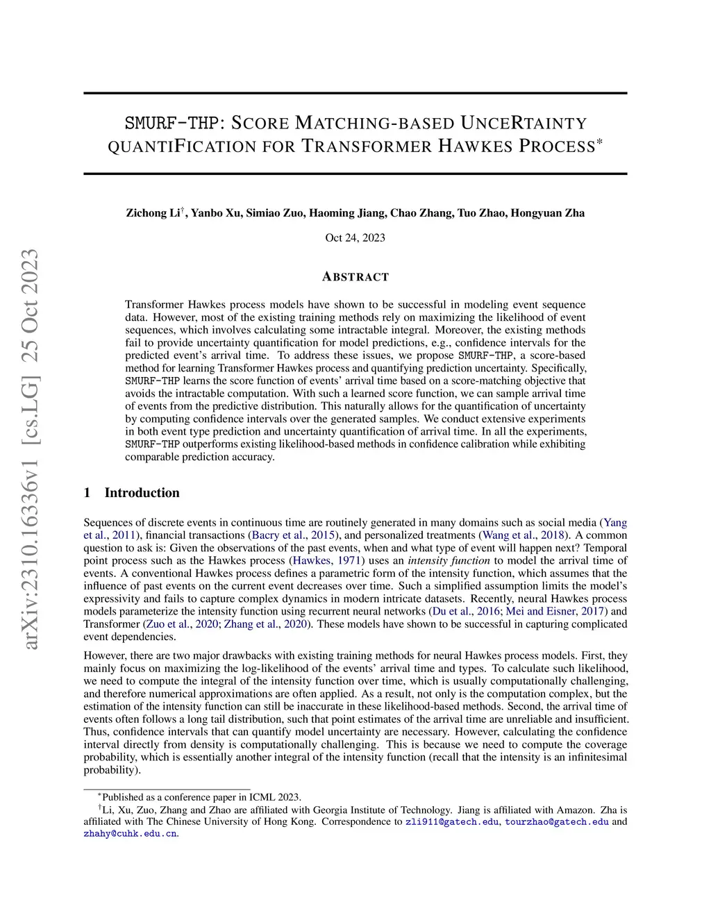 Transformer Hawkes process models have shown to be successful in modeling event sequence data. However, most of the existing training methods rely on maximizing the likelihood of event sequences, which involves calculating some intractable integral. Moreover, the existing methods fail to provide uncertainty quantification for model predictions, e.g., confidence intervals for the predicted event's arrival time. To address these issues, we propose SMURF-THP, a score-based method for learning Transformer Hawkes process and quantifying prediction uncertainty. Specifically, SMURF-THP learns the score function of events' arrival time based on a score-matching objective that avoids the intractable computation. With such a learned score function, we can sample arrival time of events from the predictive distribution. This naturally allows for the quantification of uncertainty by computing confidence intervals over the generated samples. We conduct extensive experiments in both event type prediction and uncertainty quantification of arrival time. In all the experiments, SMURF-THP outperforms existing likelihood-based methods in confidence calibration while exhibiting comparable prediction accuracy.
