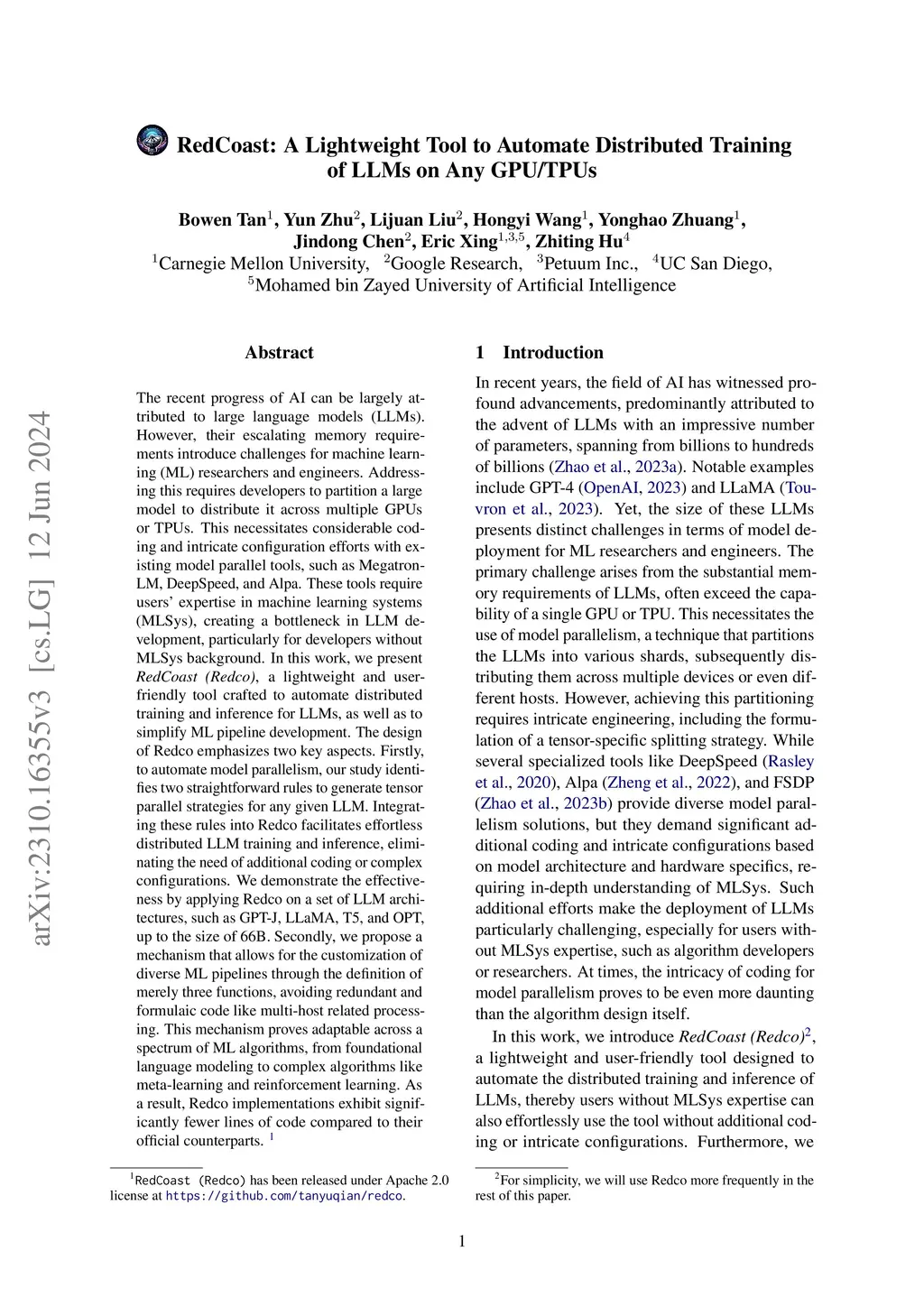 The recent progress of AI can be largely attributed to large language models (LLMs). However, their escalating memory requirements introduce challenges for machine learning (ML) researchers and engineers. Addressing this requires developers to partition a large model to distribute it across multiple GPUs or TPUs. This necessitates considerable coding and intricate configuration efforts with existing model parallel tools, such as Megatron-LM, DeepSpeed, and Alpa. These tools require users' expertise in machine learning systems (MLSys), creating a bottleneck in LLM development, particularly for developers without MLSys background. In this work, we present RedCoast (Redco), a lightweight and user-friendly tool crafted to automate distributed training and inference for LLMs, as well as to simplify ML pipeline development. The design of Redco emphasizes two key aspects. Firstly, to automate model parallelism, our study identifies two straightforward rules to generate tensor parallel strategies for any given LLM. Integrating these rules into Redco facilitates effortless distributed LLM training and inference, eliminating the need of additional coding or complex configurations. We demonstrate the effectiveness by applying Redco on a set of LLM architectures, such as GPT-J, LLaMA, T5, and OPT, up to the size of 66B. Secondly, we propose a mechanism that allows for the customization of diverse ML pipelines through the definition of merely three functions, avoiding redundant and formulaic code like multi-host related processing. This mechanism proves adaptable across a spectrum of ML algorithms, from foundational language modeling to complex algorithms like meta-learning and reinforcement learning. As a result, Redco implementations exhibit significantly fewer lines of code compared to their official counterparts.