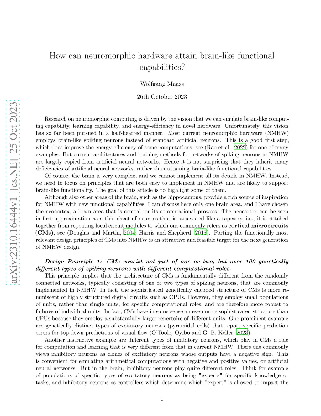 Research on neuromorphic computing is driven by the vision that we can emulate brain-like computing capability, learning capability, and energy-efficiency in novel hardware. Unfortunately, this vision has so far been pursued in a half-hearted manner. Most current neuromorphic hardware (NMHW) employs brain-like spiking neurons instead of standard artificial neurons. This is a good first step, which does improve the energy-efficiency of some computations, see \citep{rao2022long} for one of many examples. But current architectures and training methods for networks of spiking neurons in NMHW are largely copied from artificial neural networks. Hence it is not surprising that they inherit many deficiencies of artificial neural networks, rather than attaining brain-like functional capabilities. Of course, the brain is very complex, and we cannot implement all its details in NMHW. Instead, we need to focus on principles that are both easy to implement in NMHW and are likely to support brain-like functionality. The goal of this article is to highlight some of them.