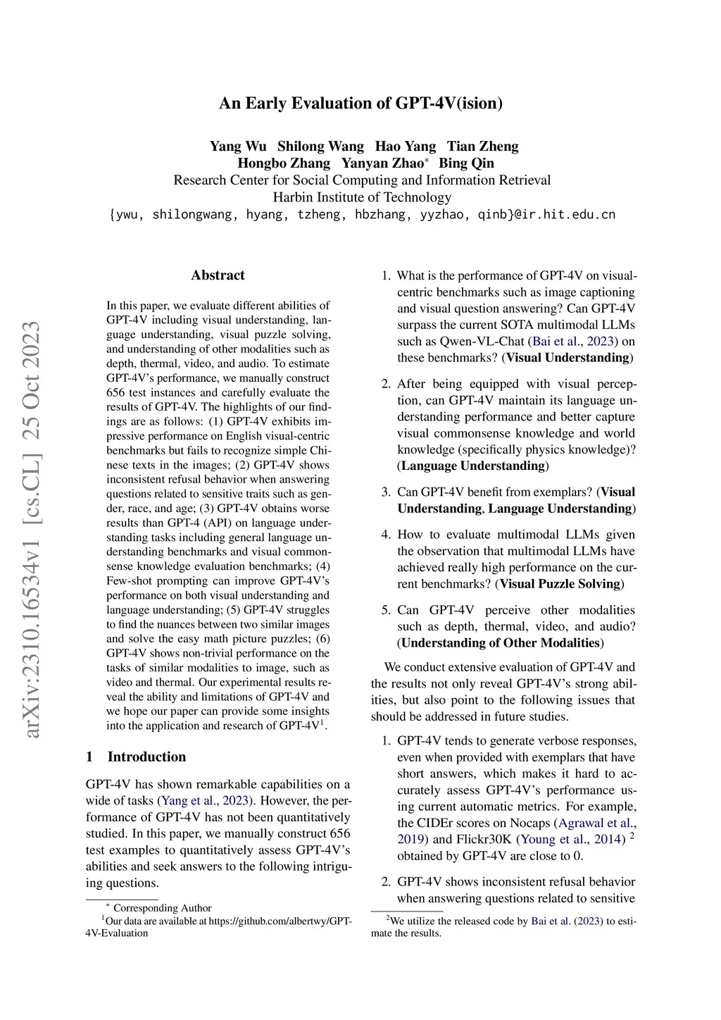 In this paper, we evaluate different abilities of GPT-4V including visual understanding, language understanding, visual puzzle solving, and understanding of other modalities such as depth, thermal, video, and audio. To estimate GPT-4V's performance, we manually construct 656 test instances and carefully evaluate the results of GPT-4V. The highlights of our findings are as follows: (1) GPT-4V exhibits impressive performance on English visual-centric benchmarks but fails to recognize simple Chinese texts in the images; (2) GPT-4V shows inconsistent refusal behavior when answering questions related to sensitive traits such as gender, race, and age; (3) GPT-4V obtains worse results than GPT-4 (API) on language understanding tasks including general language understanding benchmarks and visual commonsense knowledge evaluation benchmarks; (4) Few-shot prompting can improve GPT-4V's performance on both visual understanding and language understanding; (5) GPT-4V struggles to find the nuances between two similar images and solve the easy math picture puzzles; (6) GPT-4V shows non-trivial performance on the tasks of similar modalities to image, such as video and thermal. Our experimental results reveal the ability and limitations of GPT-4V and we hope our paper can provide some insights into the application and research of GPT-4V.