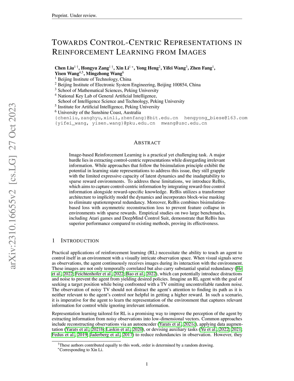 Image-based Reinforcement Learning is a practical yet challenging task. A major hurdle lies in extracting control-centric representations while disregarding irrelevant information. While approaches that follow the bisimulation principle exhibit the potential in learning state representations to address this issue, they still grapple with the limited expressive capacity of latent dynamics and the inadaptability to sparse reward environments. To address these limitations, we introduce ReBis, which aims to capture control-centric information by integrating reward-free control information alongside reward-specific knowledge. ReBis utilizes a transformer architecture to implicitly model the dynamics and incorporates block-wise masking to eliminate spatiotemporal redundancy. Moreover, ReBis combines bisimulation-based loss with asymmetric reconstruction loss to prevent feature collapse in environments with sparse rewards. Empirical studies on two large benchmarks, including Atari games and DeepMind Control Suit, demonstrate that ReBis has superior performance compared to existing methods, proving its effectiveness.