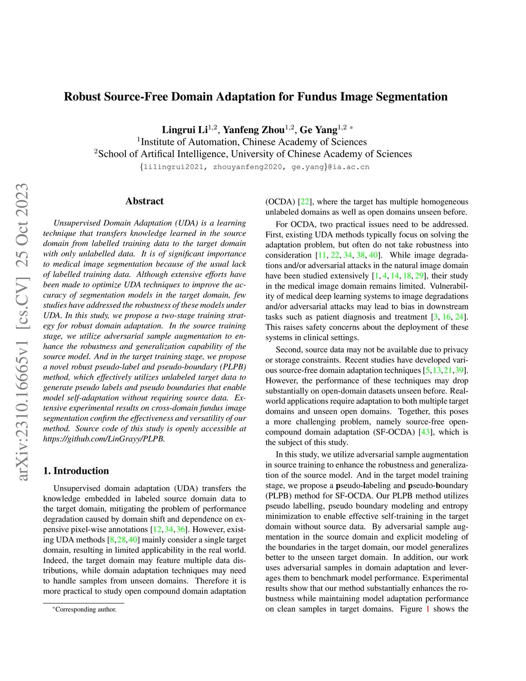 Unsupervised Domain Adaptation (UDA) is a learning technique that transfers knowledge learned in the source domain from labelled training data to the target domain with only unlabelled data. It is of significant importance to medical image segmentation because of the usual lack of labelled training data. Although extensive efforts have been made to optimize UDA techniques to improve the accuracy of segmentation models in the target domain, few studies have addressed the robustness of these models under UDA. In this study, we propose a two-stage training strategy for robust domain adaptation. In the source training stage, we utilize adversarial sample augmentation to enhance the robustness and generalization capability of the source model. And in the target training stage, we propose a novel robust pseudo-label and pseudo-boundary (PLPB) method, which effectively utilizes unlabeled target data to generate pseudo labels and pseudo boundaries that enable model self-adaptation without requiring source data. Extensive experimental results on cross-domain fundus image segmentation confirm the effectiveness and versatility of our method. Source code of this study is openly accessible at https://github.com/LinGrayy/PLPB.