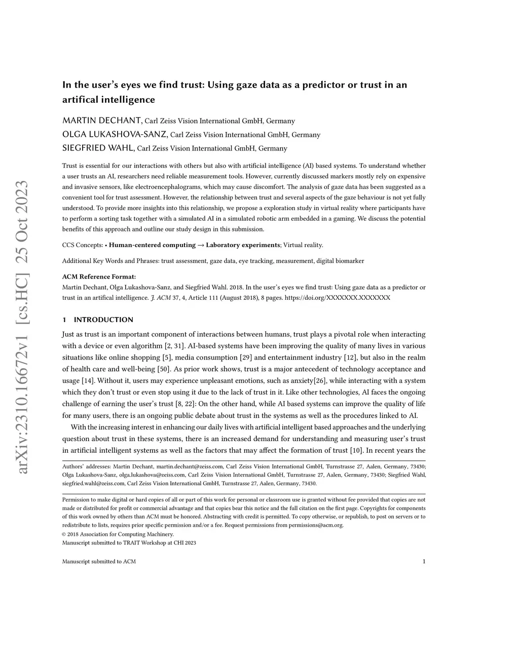 Trust is essential for our interactions with others but also with artificial intelligence (AI) based systems. To understand whether a user trusts an AI, researchers need reliable measurement tools. However, currently discussed markers mostly rely on expensive and invasive sensors, like electroencephalograms, which may cause discomfort. The analysis of gaze data has been suggested as a convenient tool for trust assessment. However, the relationship between trust and several aspects of the gaze behaviour is not yet fully understood. To provide more insights into this relationship, we propose a exploration study in virtual reality where participants have to perform a sorting task together with a simulated AI in a simulated robotic arm embedded in a gaming. We discuss the potential benefits of this approach and outline our study design in this submission.