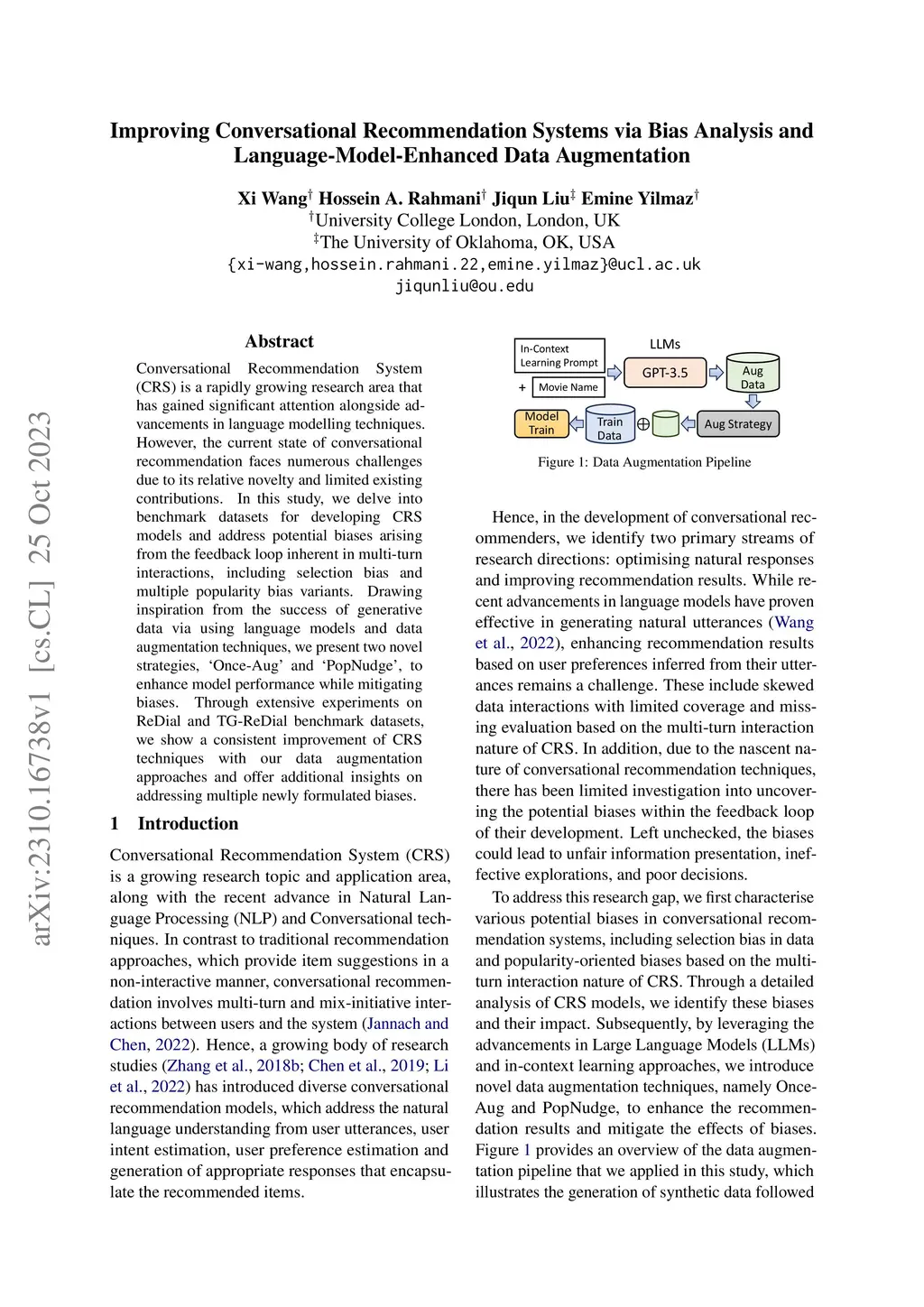Conversational Recommendation System (CRS) is a rapidly growing research area that has gained significant attention alongside advancements in language modelling techniques. However, the current state of conversational recommendation faces numerous challenges due to its relative novelty and limited existing contributions. In this study, we delve into benchmark datasets for developing CRS models and address potential biases arising from the feedback loop inherent in multi-turn interactions, including selection bias and multiple popularity bias variants. Drawing inspiration from the success of generative data via using language models and data augmentation techniques, we present two novel strategies, Ónce-Aug' and 'PopNudge', to enhance model performance while mitigating biases. Through extensive experiments on ReDial and TG-ReDial benchmark datasets, we show a consistent improvement of CRS techniques with our data augmentation approaches and offer additional insights on addressing multiple newly formulated biases.