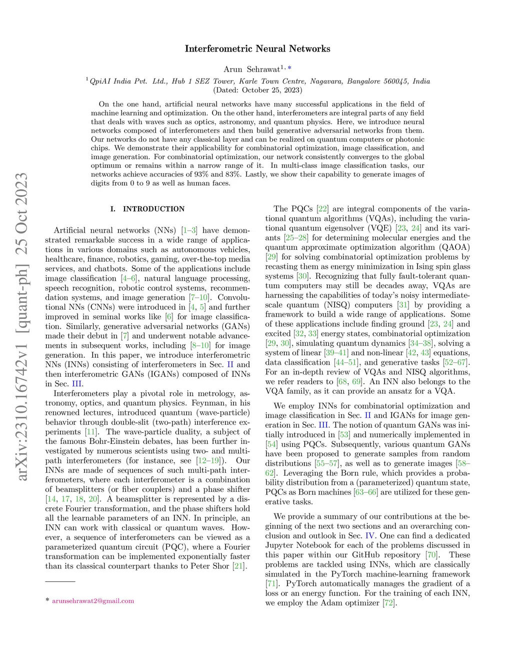 On the one hand, artificial neural networks have many successful applications in the field of machine learning and optimization. On the other hand, interferometers are integral parts of any field that deals with waves such as optics, astronomy, and quantum physics. Here, we introduce neural networks composed of interferometers and then build generative adversarial networks from them. Our networks do not have any classical layer and can be realized on quantum computers or photonic chips. We demonstrate their applicability for combinatorial optimization, image classification, and image generation. For combinatorial optimization, our network consistently converges to the global optimum or remains within a narrow range of it. In multi-class image classification tasks, our networks achieve accuracies of 93% and 83%. Lastly, we show their capability to generate images of digits from 0 to 9 as well as human faces.