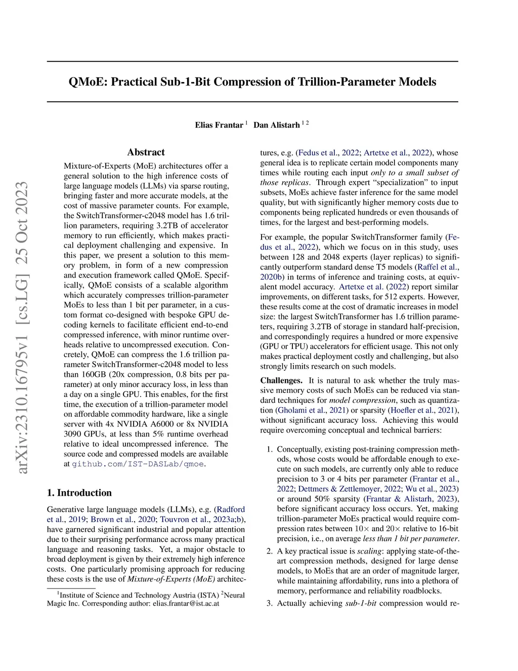 QMoE: Practical Sub-1-Bit Compression of Trillion-Parameter Models