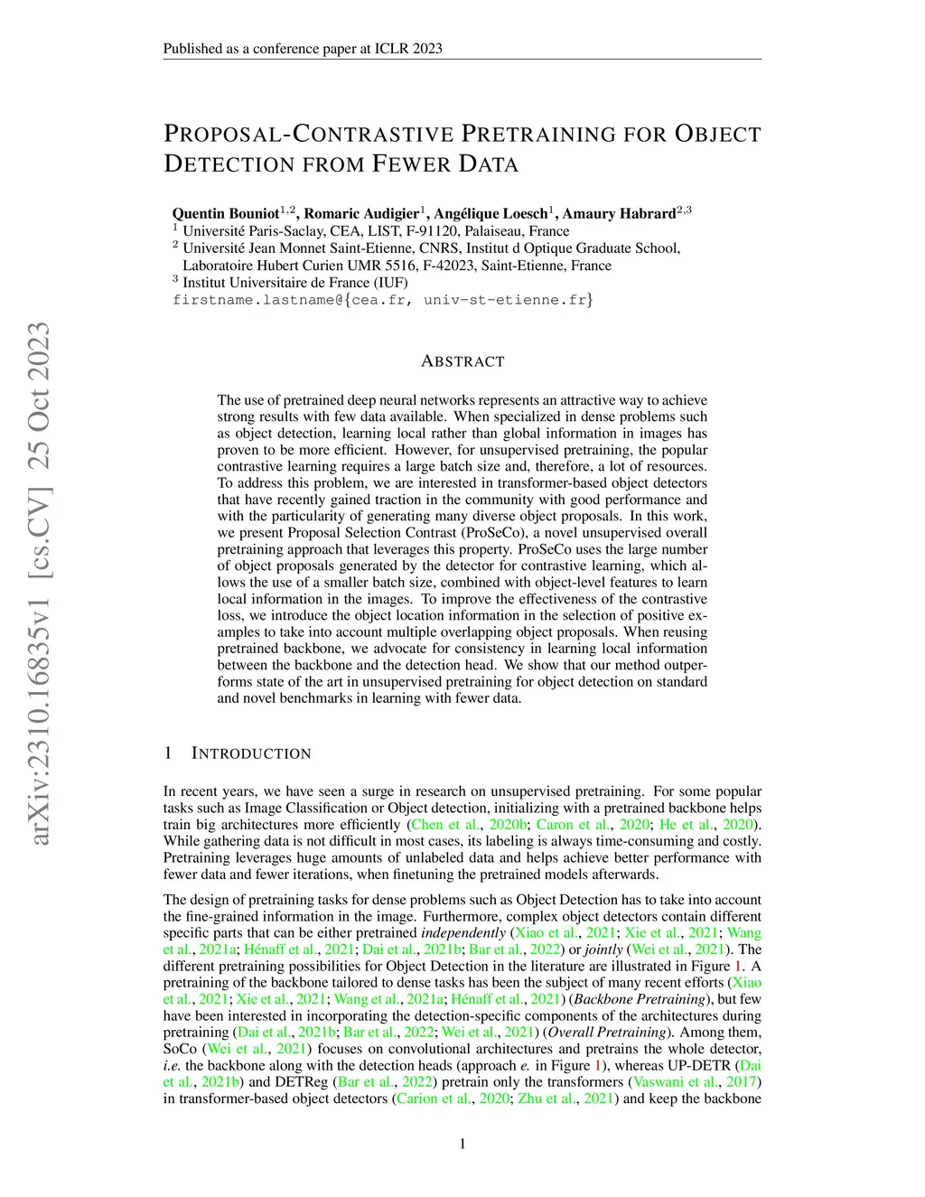 The use of pretrained deep neural networks represents an attractive way to achieve strong results with few data available. When specialized in dense problems such as object detection, learning local rather than global information in images has proven to be more efficient. However, for unsupervised pretraining, the popular contrastive learning requires a large batch size and, therefore, a lot of resources. To address this problem, we are interested in transformer-based object detectors that have recently gained traction in the community with good performance and with the particularity of generating many diverse object proposals. In this work, we present Proposal Selection Contrast (ProSeCo), a novel unsupervised overall pretraining approach that leverages this property. ProSeCo uses the large number of object proposals generated by the detector for contrastive learning, which allows the use of a smaller batch size, combined with object-level features to learn local information in the images. To improve the effectiveness of the contrastive loss, we introduce the object location information in the selection of positive examples to take into account multiple overlapping object proposals. When reusing pretrained backbone, we advocate for consistency in learning local information between the backbone and the detection head. We show that our method outperforms state of the art in unsupervised pretraining for object detection on standard and novel benchmarks in learning with fewer data.