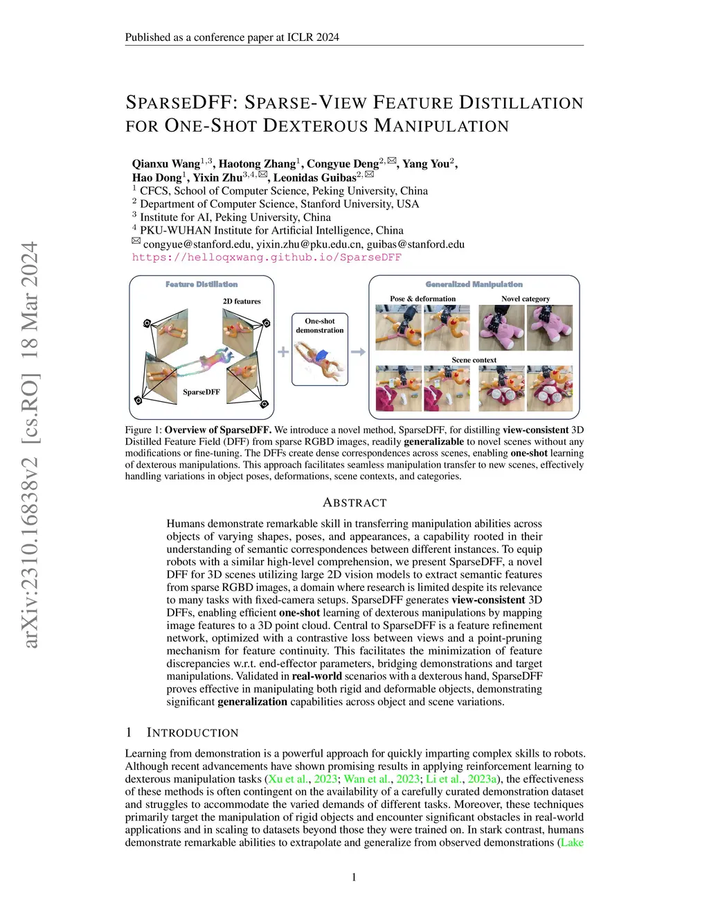 Humans demonstrate remarkable skill in transferring manipulation abilities across objects of varying shapes, poses, and appearances, a capability rooted in their understanding of semantic correspondences between different instances. To equip robots with a similar high-level comprehension, we present SparseDFF, a novel DFF for 3D scenes utilizing large 2D vision models to extract semantic features from sparse RGBD images, a domain where research is limited despite its relevance to many tasks with fixed-camera setups. SparseDFF generates view-consistent 3D DFFs, enabling efficient one-shot learning of dexterous manipulations by mapping image features to a 3D point cloud. Central to SparseDFF is a feature refinement network, optimized with a contrastive loss between views and a point-pruning mechanism for feature continuity. This facilitates the minimization of feature discrepancies w.r.t. end-effector parameters, bridging demonstrations and target manipulations. Validated in real-world scenarios with a dexterous hand, SparseDFF proves effective in manipulating both rigid and deformable objects, demonstrating significant generalization capabilities across object and scene variations.