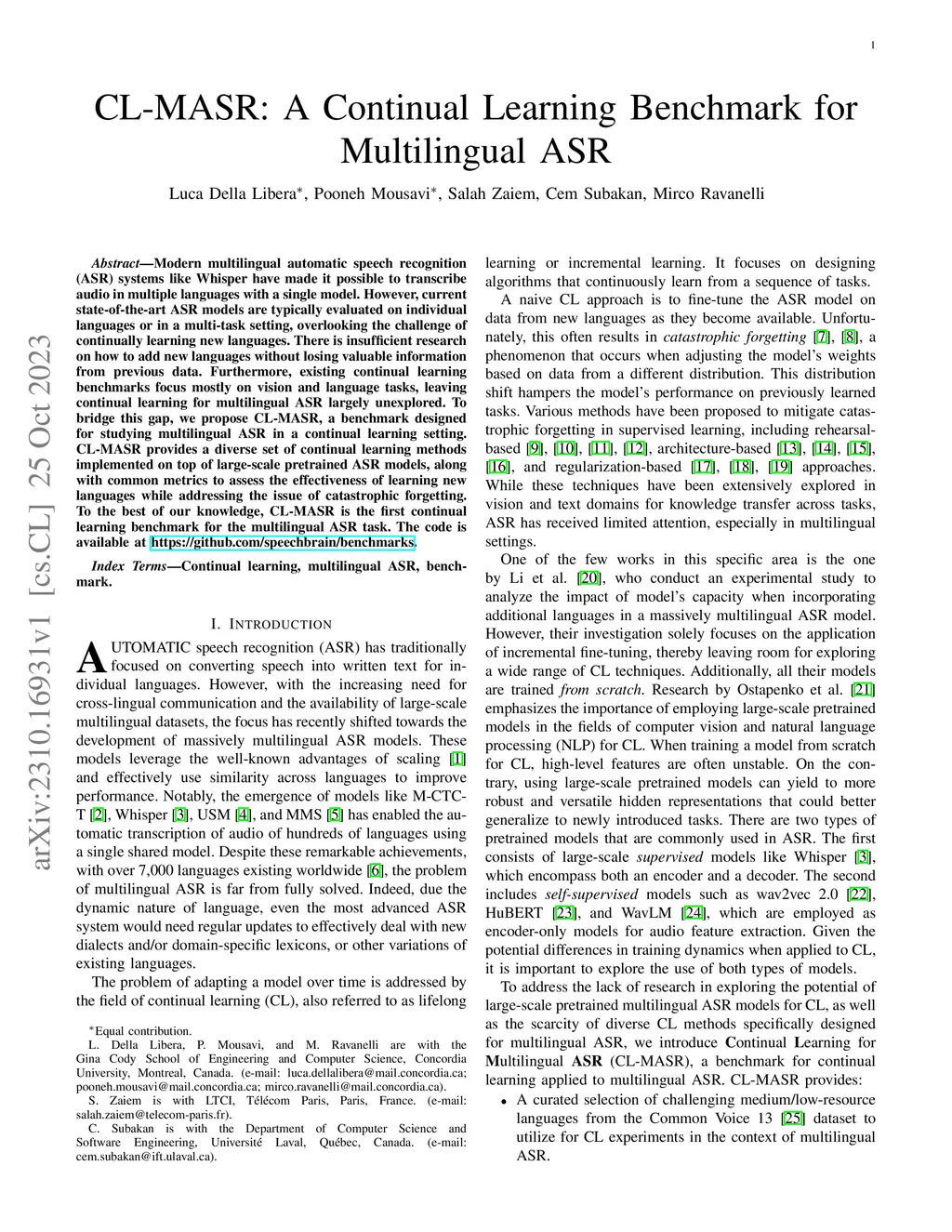 Modern multilingual automatic speech recognition (ASR) systems like Whisper have made it possible to transcribe audio in multiple languages with a single model. However, current state-of-the-art ASR models are typically evaluated on individual languages or in a multi-task setting, overlooking the challenge of continually learning new languages. There is insufficient research on how to add new languages without losing valuable information from previous data. Furthermore, existing continual learning benchmarks focus mostly on vision and language tasks, leaving continual learning for multilingual ASR largely unexplored. To bridge this gap, we propose CL-MASR, a benchmark designed for studying multilingual ASR in a continual learning setting. CL-MASR provides a diverse set of continual learning methods implemented on top of large-scale pretrained ASR models, along with common metrics to assess the effectiveness of learning new languages while addressing the issue of catastrophic forgetting. To the best of our knowledge, CL-MASR is the first continual learning benchmark for the multilingual ASR task. The code is available at https://github.com/speechbrain/benchmarks.