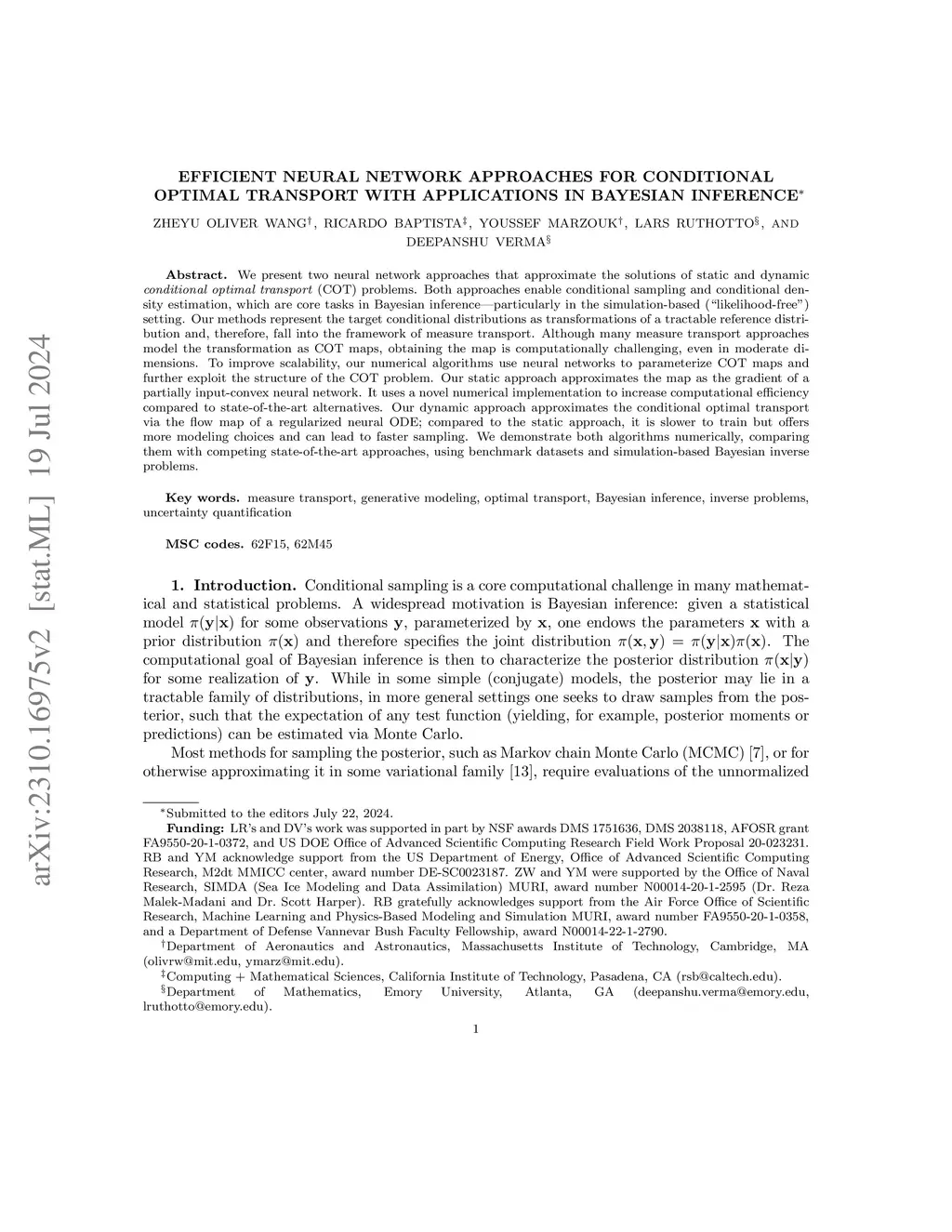 We present two neural network approaches that approximate the solutions of static and dynamic (COT) problems. Both approaches enable conditional sampling and conditional density estimation, which are core tasks in Bayesian inferenceparticularly in the simulation-based (likelihood-free) setting. Our methods represent the target conditional distribution as a transformation of a tractable reference distribution. Obtaining such a transformation, chosen here to be an approximation of the COT map, is computationally challenging even in moderate dimensions. To improve scalability, our numerical algorithms use neural networks to parameterize candidate maps and further exploit the structure of the COT problem. Our static approach approximates the map as the gradient of a partially input-convex neural network. It uses a novel numerical implementation to increase computational efficiency compared to state-of-the-art alternatives. Our dynamic approach approximates the conditional optimal transport via the flow map of a regularized neural ODE; compared to the static approach, it is slower to train but offers more modeling choices and can lead to faster sampling. We demonstrate both algorithms numerically, comparing them with competing state-of-the-art approaches, using benchmark datasets and simulation-based Bayesian inverse problems.