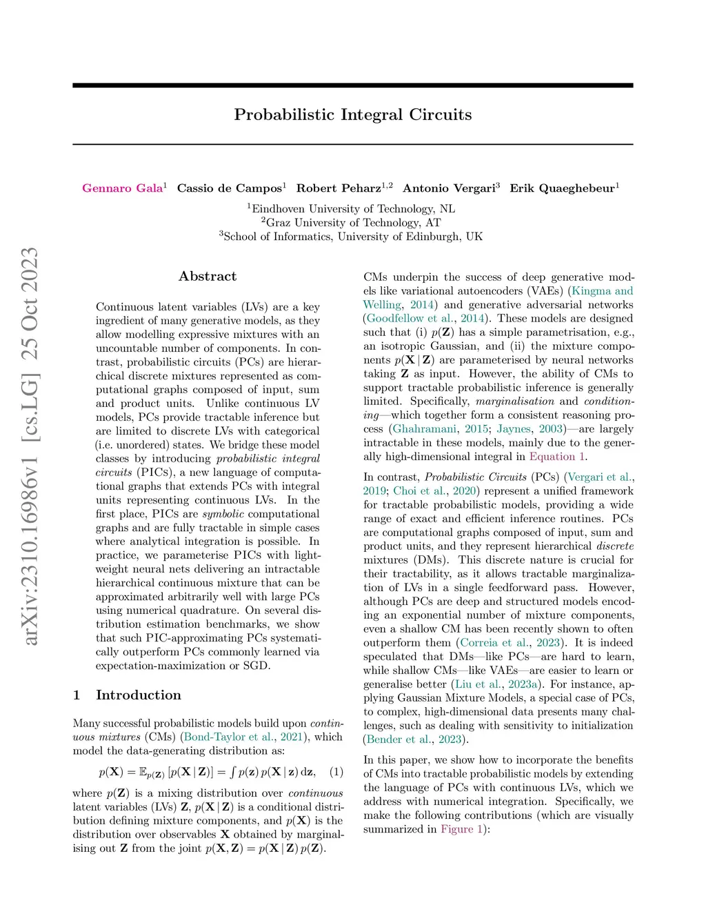 Continuous latent variables (LVs) are a key ingredient of many generative models, as they allow modelling expressive mixtures with an uncountable number of components. In contrast, probabilistic circuits (PCs) are hierarchical discrete mixtures represented as computational graphs composed of input, sum and product units. Unlike continuous LV models, PCs provide tractable inference but are limited to discrete LVs with categorical (i.e. unordered) states. We bridge these model classes by introducing probabilistic integral circuits (PICs), a new language of computational graphs that extends PCs with integral units representing continuous LVs. In the first place, PICs are symbolic computational graphs and are fully tractable in simple cases where analytical integration is possible. In practice, we parameterise PICs with light-weight neural nets delivering an intractable hierarchical continuous mixture that can be approximated arbitrarily well with large PCs using numerical quadrature. On several distribution estimation benchmarks, we show that such PIC-approximating PCs systematically outperform PCs commonly learned via expectation-maximization or SGD.