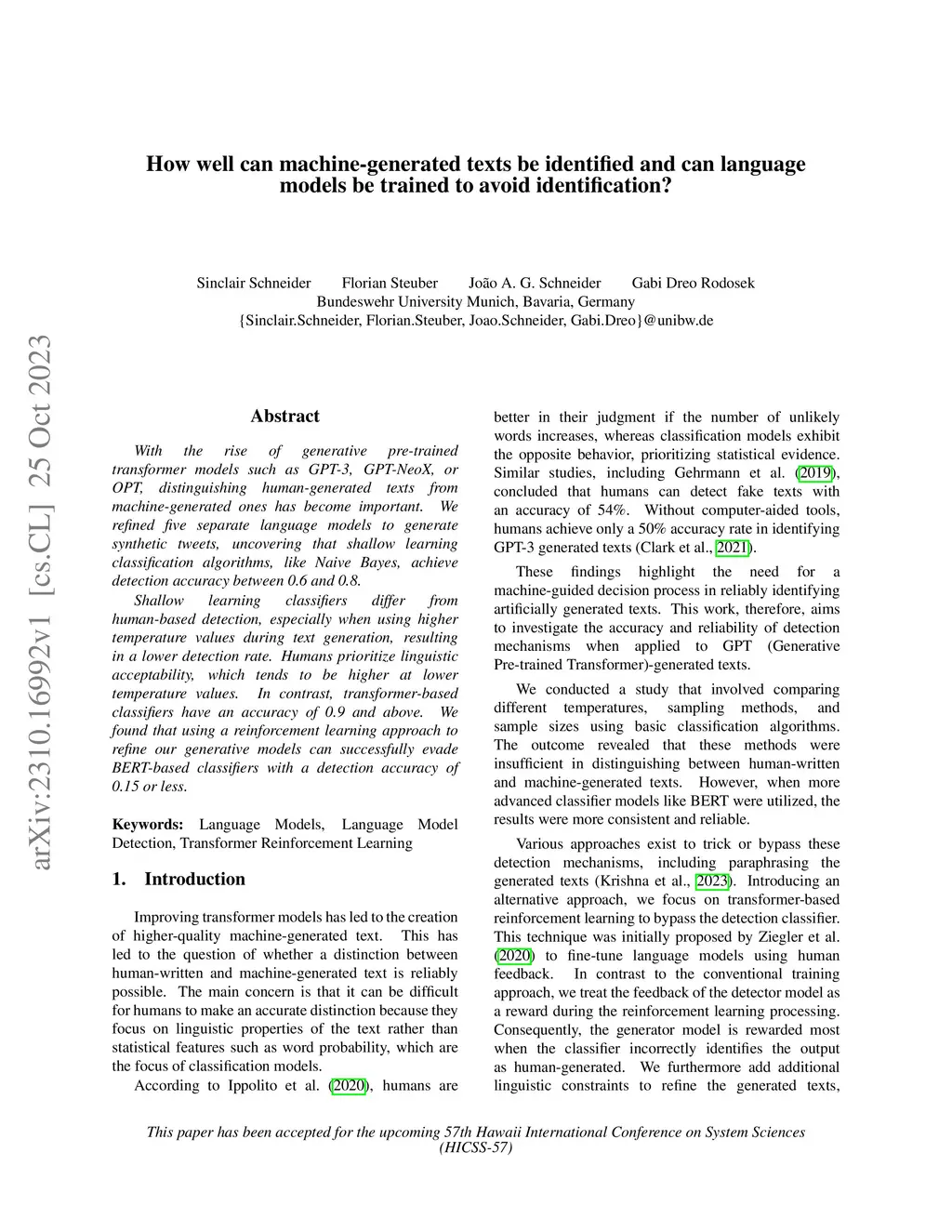 With the rise of generative pre-trained transformer models such as GPT-3, GPT-NeoX, or OPT, distinguishing human-generated texts from machine-generated ones has become important. We refined five separate language models to generate synthetic tweets, uncovering that shallow learning classification algorithms, like Naive Bayes, achieve detection accuracy between 0.6 and 0.8. Shallow learning classifiers differ from human-based detection, especially when using higher temperature values during text generation, resulting in a lower detection rate. Humans prioritize linguistic acceptability, which tends to be higher at lower temperature values. In contrast, transformer-based classifiers have an accuracy of 0.9 and above. We found that using a reinforcement learning approach to refine our generative models can successfully evade BERT-based classifiers with a detection accuracy of 0.15 or less.