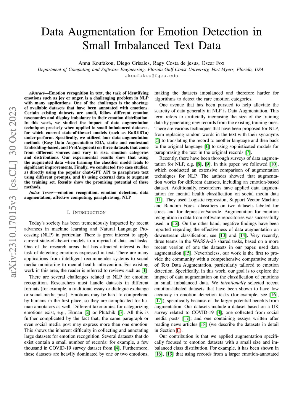 Data Augmentation for Emotion Detection in Small Imbalanced Text Data