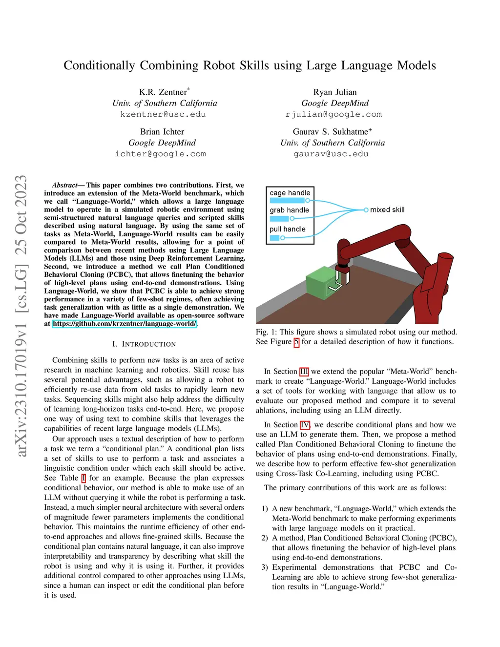 This paper combines two contributions. First, we introduce an extension of the Meta-World benchmark, which we call "Language-World," which allows a large language model to operate in a simulated robotic environment using semi-structured natural language queries and scripted skills described using natural language. By using the same set of tasks as Meta-World, Language-World results can be easily compared to Meta-World results, allowing for a point of comparison between recent methods using Large Language Models (LLMs) and those using Deep Reinforcement Learning. Second, we introduce a method we call Plan Conditioned Behavioral Cloning (PCBC), that allows finetuning the behavior of high-level plans using end-to-end demonstrations. Using Language-World, we show that PCBC is able to achieve strong performance in a variety of few-shot regimes, often achieving task generalization with as little as a single demonstration. We have made Language-World available as open-source software at https://github.com/krzentner/language-world/.