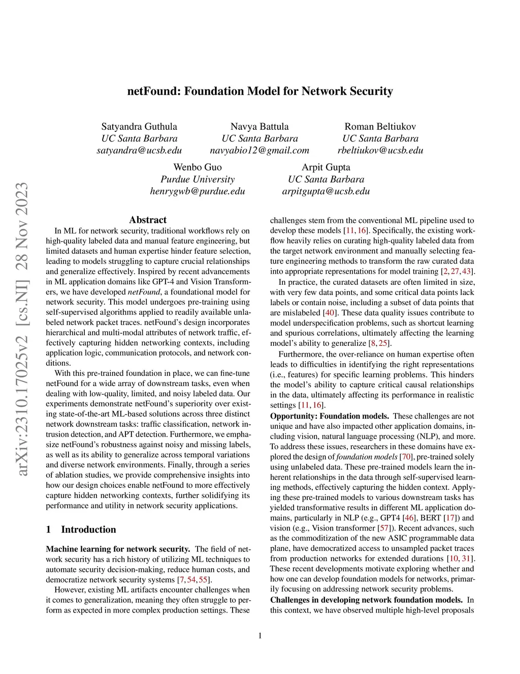 In ML for network security, traditional workflows rely on high-quality labeled data and manual feature engineering, but limited datasets and human expertise hinder feature selection, leading to models struggling to capture crucial relationships and generalize effectively. Inspired by recent advancements in ML application domains like GPT-4 and Vision Transformers, we have developed netFound, a foundational model for network security. This model undergoes pre-training using self-supervised algorithms applied to readily available unlabeled network packet traces. netFound's design incorporates hierarchical and multi-modal attributes of network traffic, effectively capturing hidden networking contexts, including application logic, communication protocols, and network conditions. With this pre-trained foundation in place, we can fine-tune netFound for a wide array of downstream tasks, even when dealing with low-quality, limited, and noisy labeled data. Our experiments demonstrate netFound's superiority over existing state-of-the-art ML-based solutions across three distinct network downstream tasks: traffic classification, network intrusion detection, and APT detection. Furthermore, we emphasize netFound's robustness against noisy and missing labels, as well as its ability to generalize across temporal variations and diverse network environments. Finally, through a series of ablation studies, we provide comprehensive insights into how our design choices enable netFound to more effectively capture hidden networking contexts, further solidifying its performance and utility in network security applications.
