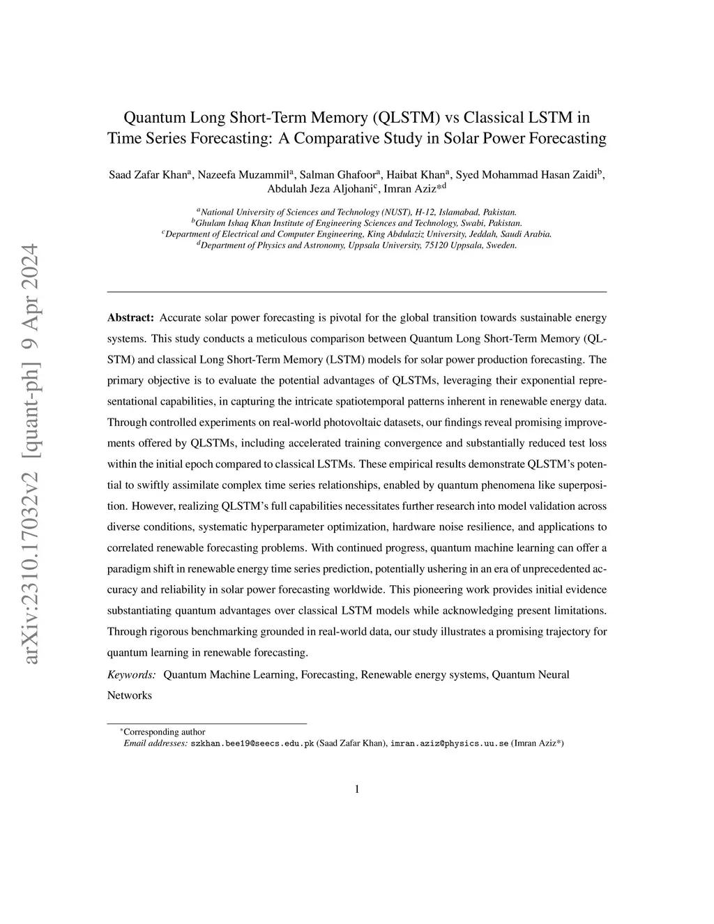 Accurate solar power forecasting is pivotal for the global transition towards sustainable energy systems. This study conducts a meticulous comparison between Quantum Long Short-Term Memory (QLSTM) and classical Long Short-Term Memory (LSTM) models for solar power production forecasting. The primary objective is to evaluate the potential advantages of QLSTMs, leveraging their exponential representational capabilities, in capturing the intricate spatiotemporal patterns inherent in renewable energy data. Through controlled experiments on real-world photovoltaic datasets, our findings reveal promising improvements offered by QLSTMs, including accelerated training convergence and substantially reduced test loss within the initial epoch compared to classical LSTMs. These empirical results demonstrate QLSTM's potential to swiftly assimilate complex time series relationships, enabled by quantum phenomena like superposition. However, realizing QLSTM's full capabilities necessitates further research into model validation across diverse conditions, systematic hyperparameter optimization, hardware noise resilience, and applications to correlated renewable forecasting problems. With continued progress, quantum machine learning can offer a paradigm shift in renewable energy time series prediction, potentially ushering in an era of unprecedented accuracy and reliability in solar power forecasting worldwide. This pioneering work provides initial evidence substantiating quantum advantages over classical LSTM models while acknowledging present limitations. Through rigorous benchmarking grounded in real-world data, our study illustrates a promising trajectory for quantum learning in renewable forecasting.