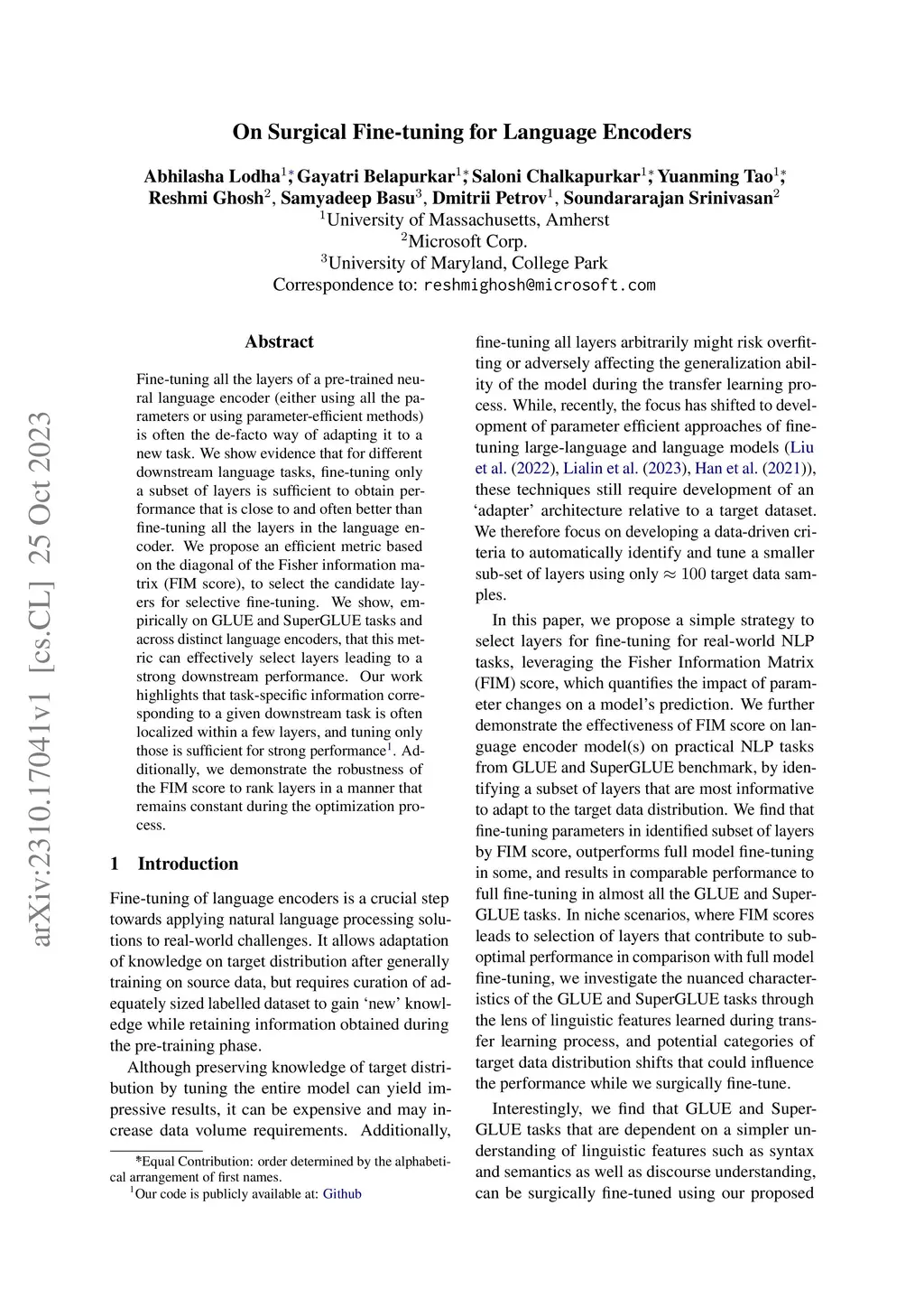 Fine-tuning all the layers of a pre-trained neural language encoder (either using all the parameters or using parameter-efficient methods) is often the de-facto way of adapting it to a new task. We show evidence that for different downstream language tasks, fine-tuning only a subset of layers is sufficient to obtain performance that is close to and often better than fine-tuning all the layers in the language encoder. We propose an efficient metric based on the diagonal of the Fisher information matrix (FIM score), to select the candidate layers for selective fine-tuning. We show, empirically on GLUE and SuperGLUE tasks and across distinct language encoders, that this metric can effectively select layers leading to a strong downstream performance. Our work highlights that task-specific information corresponding to a given downstream task is often localized within a few layers, and tuning only those is sufficient for strong performance. Additionally, we demonstrate the robustness of the FIM score to rank layers in a manner that remains constant during the optimization process.
