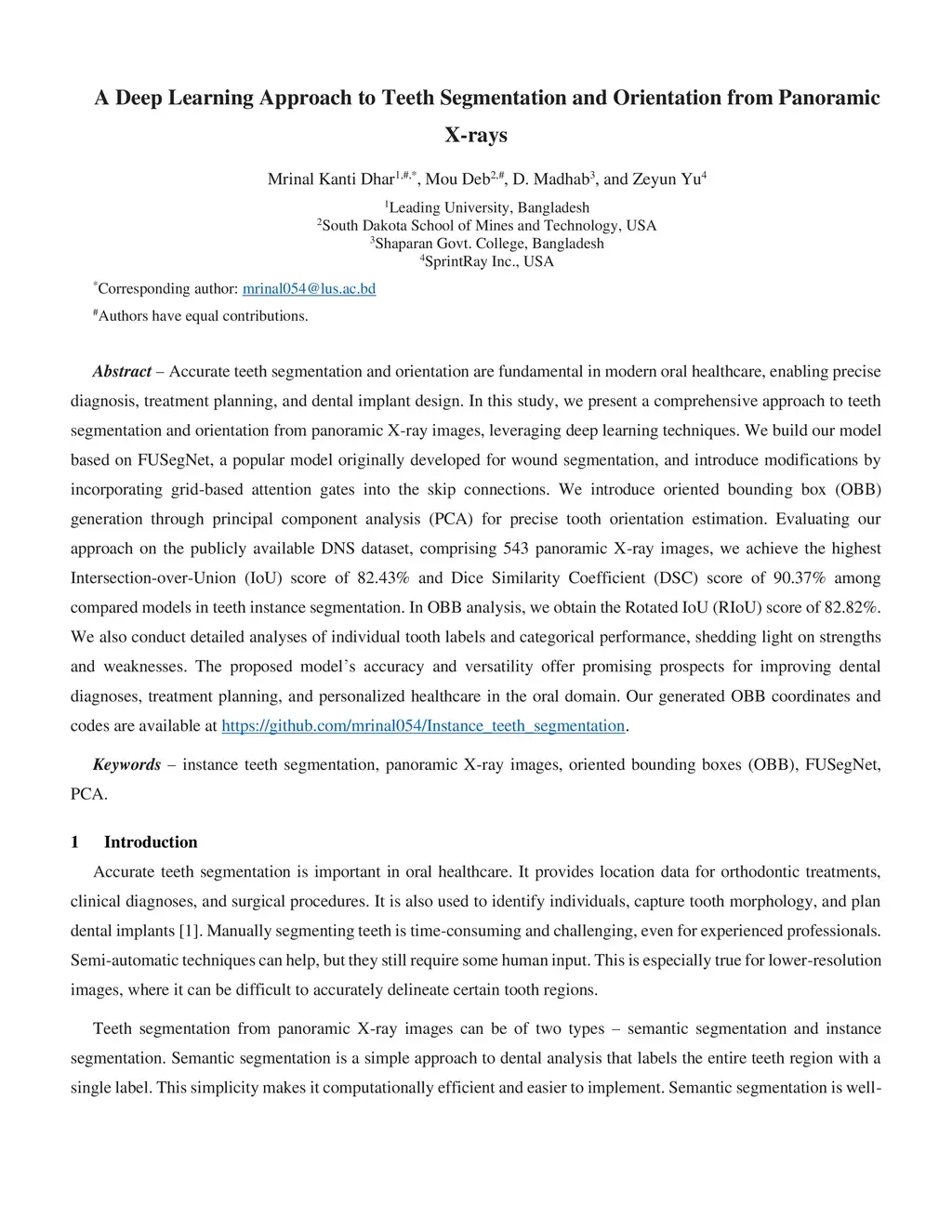 Accurate teeth segmentation and orientation are fundamental in modern oral healthcare, enabling precise diagnosis, treatment planning, and dental implant design. In this study, we present a comprehensive approach to teeth segmentation and orientation from panoramic X-ray images, leveraging deep-learning techniques. We built an end-to-end instance segmentation network that uses an encoder-decoder architecture reinforced with grid-aware attention gates along the skip connections. We introduce oriented bounding box (OBB) generation through principal component analysis (PCA) for precise tooth orientation estimation. Evaluating our approach on the publicly available DNS dataset, comprising 543 panoramic X-ray images, we achieve the highest Intersection-over-Union (IoU) score of 82.43% and a Dice Similarity Coefficient (DSC) score of 90.37% among compared models in teeth instance segmentation. In OBB analysis, we obtain a Rotated IoU (RIoU) score of 82.82%. We also conduct detailed analyses of individual tooth labels and categorical performance, shedding light on strengths and weaknesses. The proposed model's accuracy and versatility offer promising prospects for improving dental diagnoses, treatment planning, and personalized healthcare in the oral domain. Our generated OBB coordinates and code are available atthis https URL.