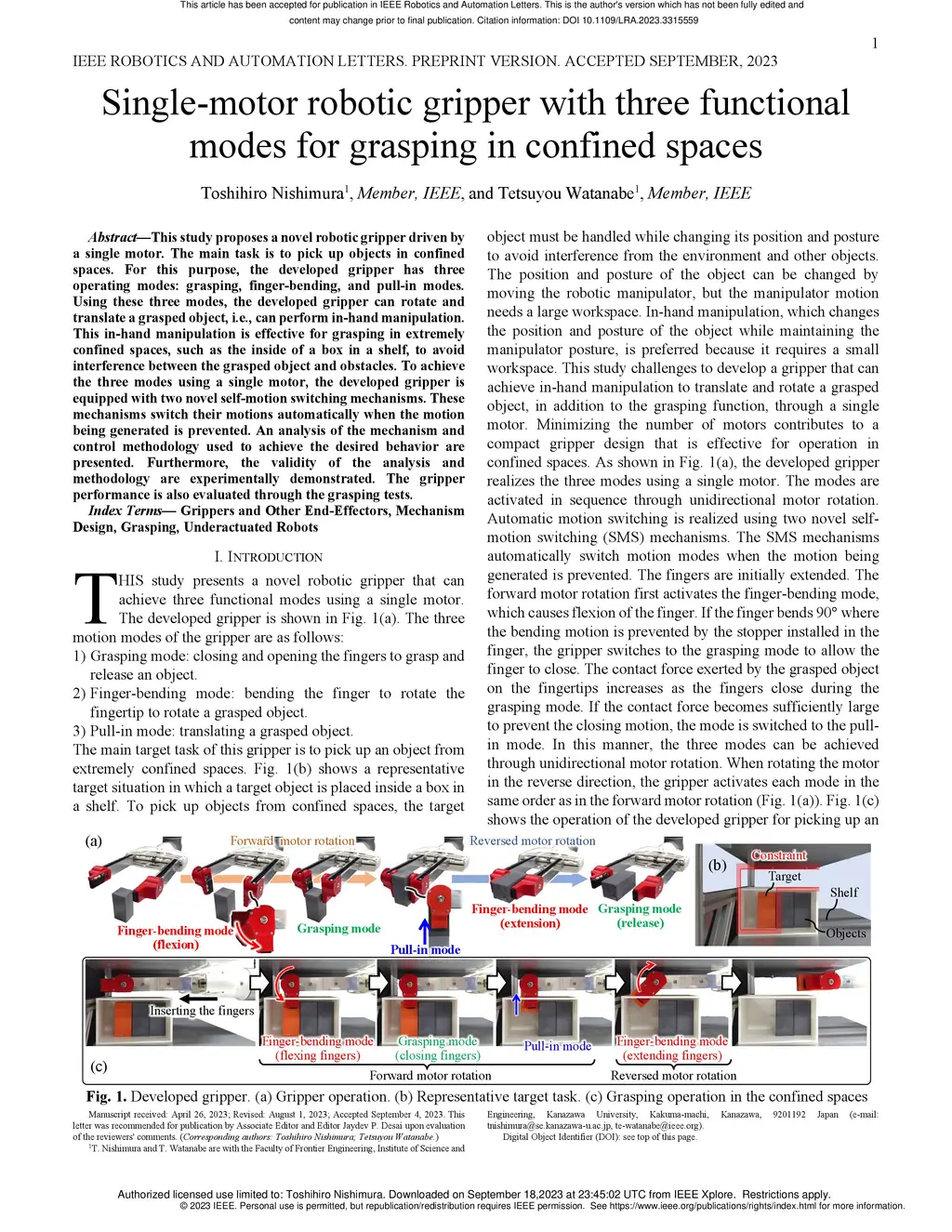 Single-Motor Robotic Gripper With Three Functional Modes for Grasping in