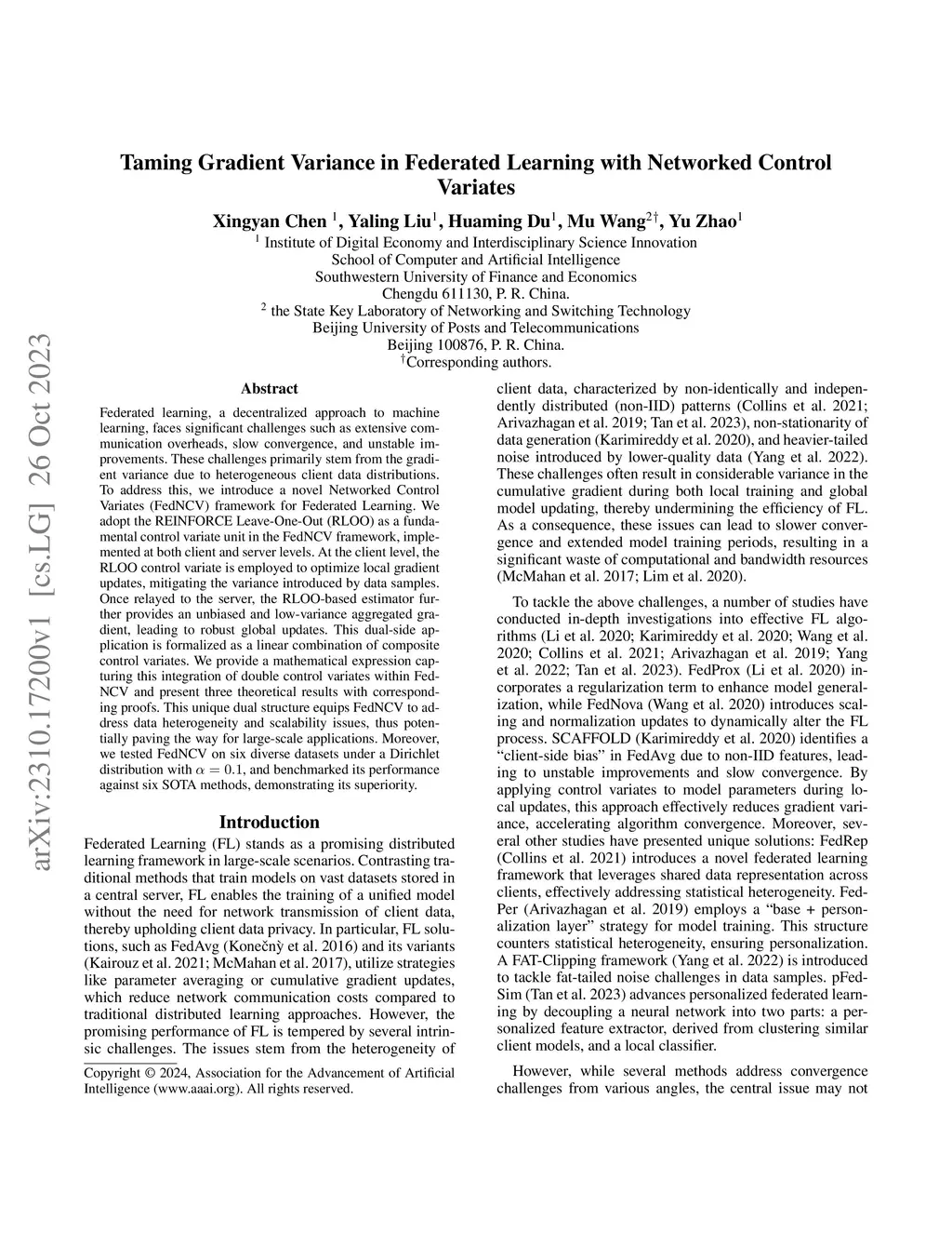 Federated learning, a decentralized approach to machine learning, faces significant challenges such as extensive communication overheads, slow convergence, and unstable improvements. These challenges primarily stem from the gradient variance due to heterogeneous client data distributions. To address this, we introduce a novel Networked Control Variates (FedNCV) framework for Federated Learning. We adopt the REINFORCE Leave-One-Out (RLOO) as a fundamental control variate unit in the FedNCV framework, implemented at both client and server levels. At the client level, the RLOO control variate is employed to optimize local gradient updates, mitigating the variance introduced by data samples. Once relayed to the server, the RLOO-based estimator further provides an unbiased and low-variance aggregated gradient, leading to robust global updates. This dual-side application is formalized as a linear combination of composite control variates. We provide a mathematical expression capturing this integration of double control variates within FedNCV and present three theoretical results with corresponding proofs. This unique dual structure equips FedNCV to address data heterogeneity and scalability issues, thus potentially paving the way for large-scale applications. Moreover, we tested FedNCV on six diverse datasets under a Dirichlet distribution with {\alpha} = 0.1, and benchmarked its performance against six SOTA methods, demonstrating its superiority.