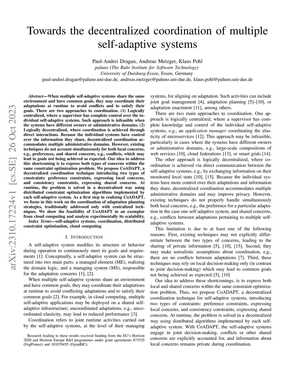 When multiple self-adaptive systems share the same environment and have common goals, they may coordinate their adaptations at runtime to avoid conflicts and to satisfy their goals. There are two approaches to coordination. (1) Logically centralized, where a supervisor has complete control over the individual self-adaptive systems. Such approach is infeasible when the systems have different owners or administrative domains. (2) Logically decentralized, where coordination is achieved through direct interactions. Because the individual systems have control over the information they share, decentralized coordination accommodates multiple administrative domains. However, existing techniques do not account simultaneously for both local concerns, e.g., preferences, and shared concerns, e.g., conflicts, which may lead to goals not being achieved as expected. Our idea to address this shortcoming is to express both types of concerns within the same constraint optimization problem. We propose CoADAPT, a decentralized coordination technique introducing two types of constraints: preference constraints, expressing local concerns, and consistency constraints, expressing shared concerns. At runtime, the problem is solved in a decentralized way using distributed constraint optimization algorithms implemented by each self-adaptive system. As a first step in realizing CoADAPT, we focus in this work on the coordination of adaptation planning strategies, traditionally addressed only with centralized techniques. We show the feasibility of CoADAPT in an exemplar from cloud computing and analyze experimentally its scalability.