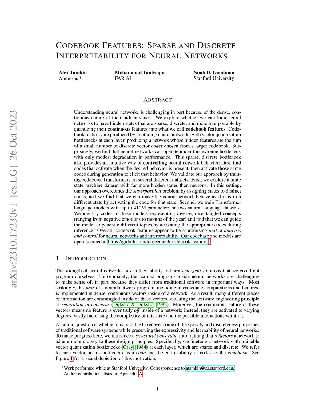 Understanding neural networks is challenging in part because of the dense, continuous nature of their hidden states. We explore whether we can train neural networks to have hidden states that are sparse, discrete, and more interpretable by quantizing their continuous features into what we call codebook features. Codebook features are produced by finetuning neural networks with vector quantization bottlenecks at each layer, producing a network whose hidden features are the sum of a small number of discrete vector codes chosen from a larger codebook. Surprisingly, we find that neural networks can operate under this extreme bottleneck with only modest degradation in performance. This sparse, discrete bottleneck also provides an intuitive way of controlling neural network behavior: first, find codes that activate when the desired behavior is present, then activate those same codes during generation to elicit that behavior. We validate our approach by training codebook Transformers on several different datasets. First, we explore a finite state machine dataset with far more hidden states than neurons. In this setting, our approach overcomes the superposition problem by assigning states to distinct codes, and we find that we can make the neural network behave as if it is in a different state by activating the code for that state. Second, we train Transformer language models with up to 410M parameters on two natural language datasets. We identify codes in these models representing diverse, disentangled concepts (ranging from negative emotions to months of the year) and find that we can guide the model to generate different topics by activating the appropriate codes during inference. Overall, codebook features appear to be a promising unit of analysis and control for neural networks and interpretability. Our codebase and models are open-sourced at https://github.com/taufeeque9/codebook-features.