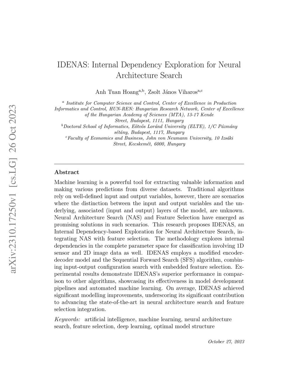 Machine learning is a powerful tool for extracting valuable information and making various predictions from diverse datasets. Traditional machine learning algorithms rely on well-defined input and output variables; however, there are scenarios where the separation between the input and output variables and the underlying, associated input and output layers of the model are unknown. Feature Selection (FS) and Neural Architecture Search (NAS) have emerged as promising solutions in such scenarios. This paper proposes MICS-EFS, a Model Input-Output Configuration Search with Embedded Feature Selection. The methodology explores internal dependencies in the complete input parameter space for classification tasks involving both 1D sensor time-series and 2D image data. MICS-EFS employs a modified encoder-decoder model and the Sequential Forward Search (SFS) algorithm, combining input-output configuration search with embedded feature selection. Experimental results demonstrate the superior performance of MICS-EFS compared to other FS algorithms. Across all tested datasets, MICS-EFS delivered an average accuracy improvement of 1.5% over baseline models, with the accuracy gains ranging from 0.5% to 5.9%. Moreover, the algorithm reduced feature dimensionality to just 2-5% of the original data, significantly enhancing computational efficiency. These results highlight the potential of MICS-EFS to improve model accuracy and efficiency in various machine learning tasks. Furthermore, the proposed method has been validated in a real-world industrial application focused on machining processes, underscoring its effectiveness and practicality in addressing complex input-output challenges.