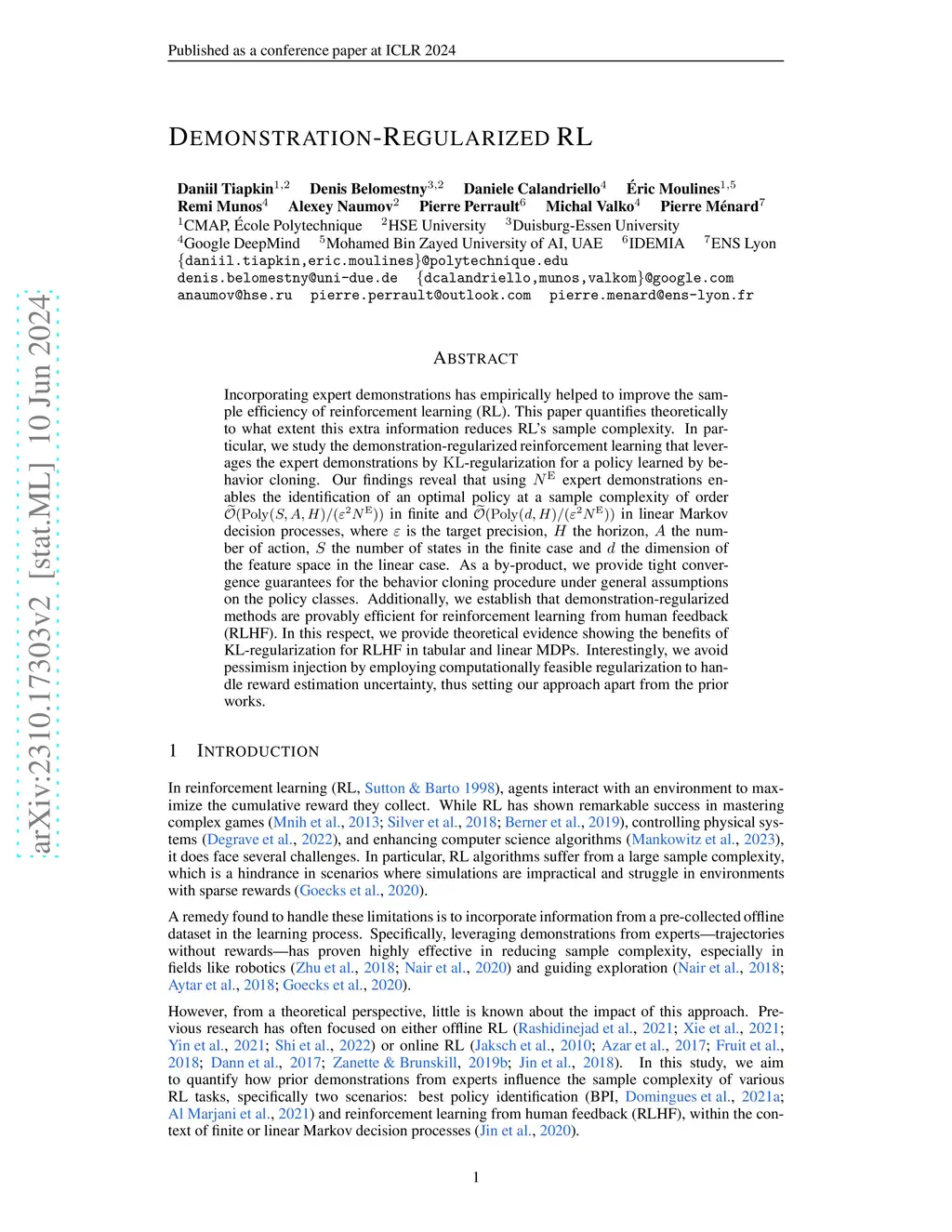 Incorporating expert demonstrations has empirically helped to improve the sample efficiency of reinforcement learning (RL). This paper quantifies theoretically to what extent this extra information reduces RL's sample complexity. In particular, we study the demonstration-regularized reinforcement learning that leverages the expert demonstrations by KL-regularization for a policy learned by behavior cloning. Our findings reveal that using expert demonstrations enables the identification of an optimal policy at a sample complexity of order in finite and in linear Markov decision processes, where is the target precision, the horizon, the number of action, the number of states in the finite case and the dimension of the feature space in the linear case. As a by-product, we provide tight convergence guarantees for the behaviour cloning procedure under general assumptions on the policy classes. Additionally, we establish that demonstration-regularized methods are provably efficient for reinforcement learning from human feedback (RLHF). In this respect, we provide theoretical evidence showing the benefits of KL-regularization for RLHF in tabular and linear MDPs. Interestingly, we avoid pessimism injection by employing computationally feasible regularization to handle reward estimation uncertainty, thus setting our approach apart from the prior works.