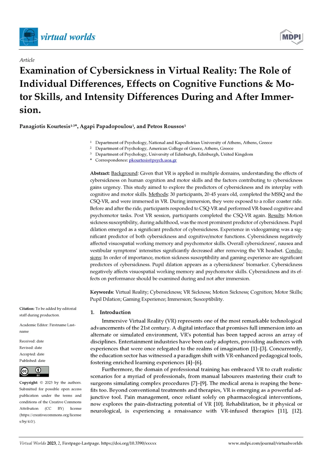 Background: Given that VR is applied in multiple domains, understanding the effects of cyber-sickness on human cognition and motor skills and the factors contributing to cybersickness gains urgency. This study aimed to explore the predictors of cybersickness and its interplay with cognitive and motor skills. Methods: 30 participants, 20-45 years old, completed the MSSQ and the CSQ-VR, and were immersed in VR. During immersion, they were exposed to a roller coaster ride. Before and after the ride, participants responded to CSQ-VR and performed VR-based cognitive and psychomotor tasks. Post-VR session, participants completed the CSQ-VR again. Results: Motion sickness susceptibility, during adulthood, was the most prominent predictor of cybersickness. Pupil dilation emerged as a significant predictor of cybersickness. Experience in videogaming was a significant predictor of both cybersickness and cognitive/motor functions. Cybersickness negatively affected visuospatial working memory and psychomotor skills. Overall cybersickness', nausea and vestibular symptoms' intensities significantly decreased after removing the VR headset. Conclusions: In order of importance, motion sickness susceptibility and gaming experience are significant predictors of cybersickness. Pupil dilation appears as a cybersickness' biomarker. Cybersickness negatively affects visuospatial working memory and psychomotor skills. Cybersickness and its effects on performance should be examined during and not after immersion.