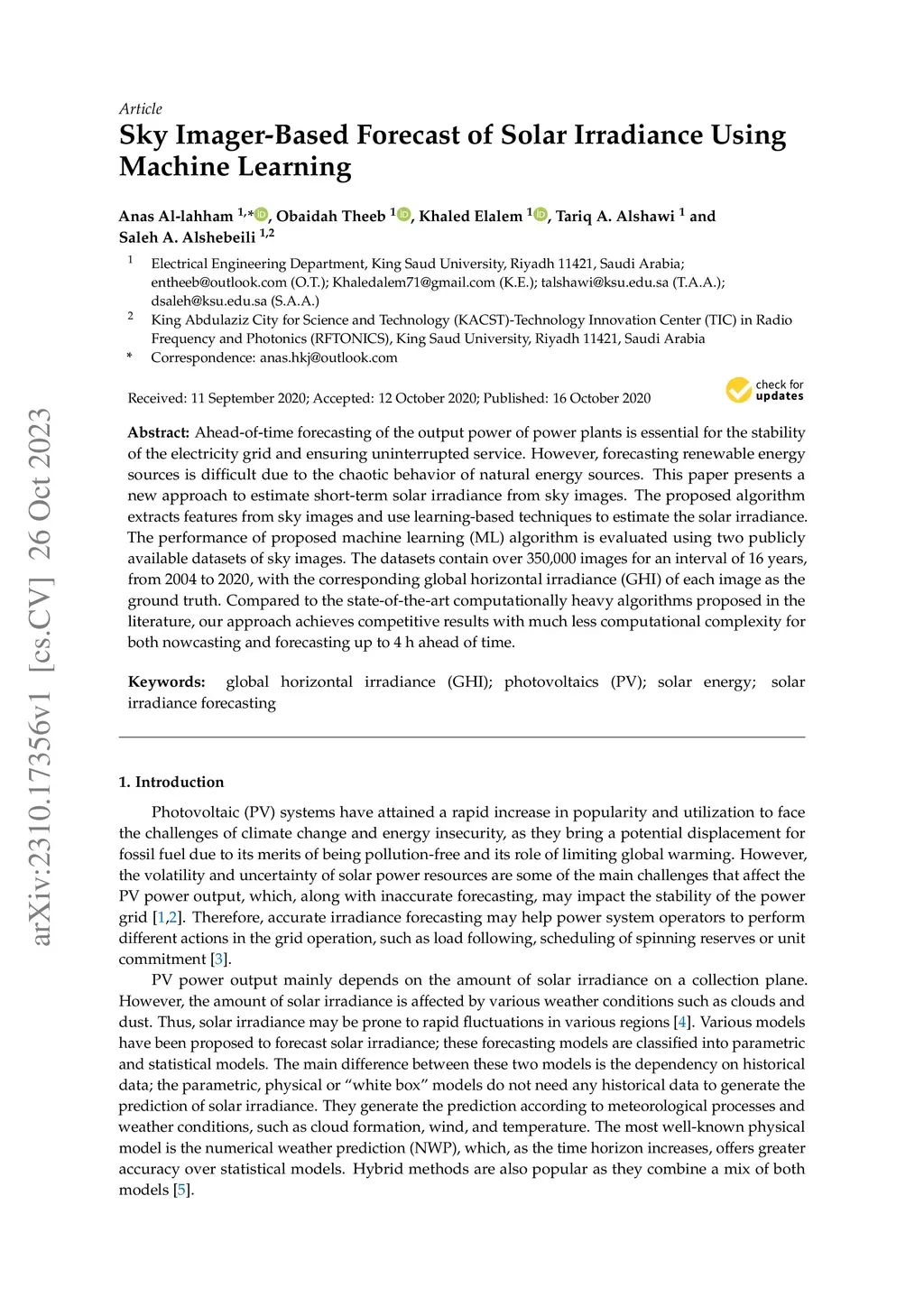 Ahead-of-time forecasting of the output power of power plants is essential for the stability of the electricity grid and ensuring uninterrupted service. However, forecasting renewable energy sources is difficult due to the chaotic behavior of natural energy sources. This paper presents a new approach to estimate short-term solar irradiance from sky images. The~proposed algorithm extracts features from sky images and use learning-based techniques to estimate the solar irradiance. The~performance of proposed machine learning (ML) algorithm is evaluated using two publicly available datasets of sky images. The~datasets contain over 350,000 images for an interval of 16 years, from 2004 to 2020, with the corresponding global horizontal irradiance (GHI) of each image as the ground truth. Compared to the state-of-the-art computationally heavy algorithms proposed in the literature, our approach achieves competitive results with much less computational complexity for both nowcasting and forecasting up to 4 h ahead of time.