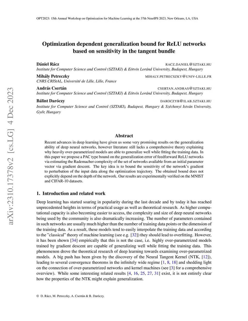 Recent advances in deep learning have given us some very promising results on the generalization ability of deep neural networks, however literature still lacks a comprehensive theory explaining why heavily over-parametrized models are able to generalize well while fitting the training data. In this paper we propose a PAC type bound on the generalization error of feedforward ReLU networks via estimating the Rademacher complexity of the set of networks available from an initial parameter vector via gradient descent. The key idea is to bound the sensitivity of the network's gradient to perturbation of the input data along the optimization trajectory. The obtained bound does not explicitly depend on the depth of the network. Our results are experimentally verified on the MNIST and CIFAR-10 datasets.