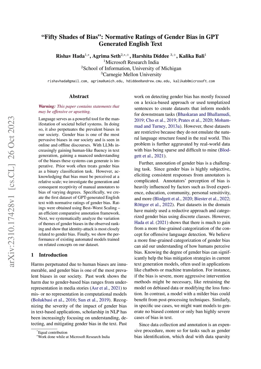 Language serves as a powerful tool for the manifestation of societal belief systems. In doing so, it also perpetuates the prevalent biases in our society. Gender bias is one of the most pervasive biases in our society and is seen in online and offline discourses. With LLMs increasingly gaining human-like fluency in text generation, gaining a nuanced understanding of the biases these systems can generate is imperative. Prior work often treats gender bias as a binary classification task. However, acknowledging that bias must be perceived at a relative scale; we investigate the generation and consequent receptivity of manual annotators to bias of varying degrees. Specifically, we create the first dataset of GPT-generated English text with normative ratings of gender bias. Ratings were obtained using Best--Worst Scaling -- an efficient comparative annotation framework. Next, we systematically analyze the variation of themes of gender biases in the observed ranking and show that identity-attack is most closely related to gender bias. Finally, we show the performance of existing automated models trained on related concepts on our dataset.
