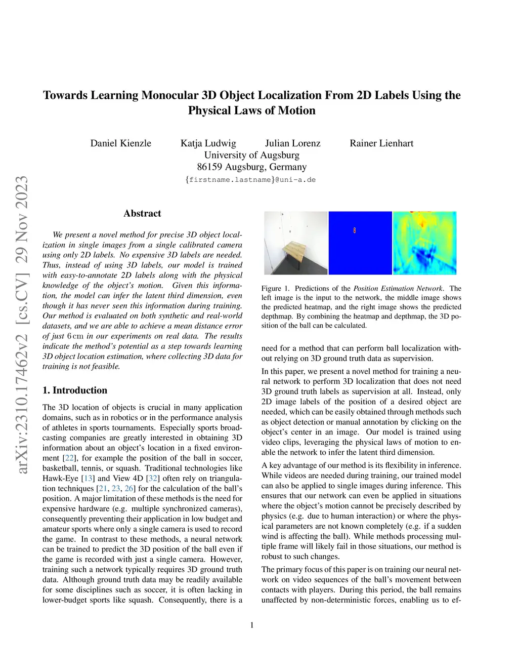 We present a novel method for precise 3D object localization in single images from a single calibrated camera using only 2D labels. No expensive 3D labels are needed. Thus, instead of using 3D labels, our model is trained with easy-to-annotate 2D labels along with the physical knowledge of the object's motion. Given this information, the model can infer the latent third dimension, even though it has never seen this information during training. Our method is evaluated on both synthetic and real-world datasets, and we are able to achieve a mean distance error of just 6 cm in our experiments on real data. The results indicate the method's potential as a step towards learning 3D object location estimation, where collecting 3D data for training is not feasible.