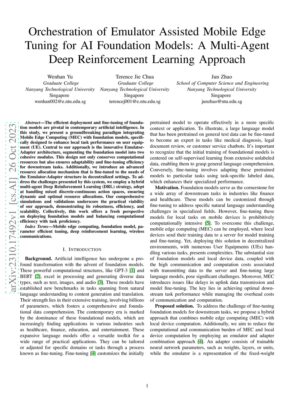 The efficient deployment and fine-tuning of foundation models are pivotal in contemporary artificial intelligence. In this study, we present a groundbreaking paradigm integrating Mobile Edge Computing (MEC) with foundation models, specifically designed to enhance local task performance on user equipment (UE). Central to our approach is the innovative Emulator-Adapter architecture, segmenting the foundation model into two cohesive modules. This design not only conserves computational resources but also ensures adaptability and fine-tuning efficiency for downstream tasks. Additionally, we introduce an advanced resource allocation mechanism that is fine-tuned to the needs of the Emulator-Adapter structure in decentralized settings. To address the challenges presented by this system, we employ a hybrid multi-agent Deep Reinforcement Learning (DRL) strategy, adept at handling mixed discrete-continuous action spaces, ensuring dynamic and optimal resource allocations. Our comprehensive simulations and validations underscore the practical viability of our approach, demonstrating its robustness, efficiency, and scalability. Collectively, this work offers a fresh perspective on deploying foundation models and balancing computational efficiency with task proficiency.
