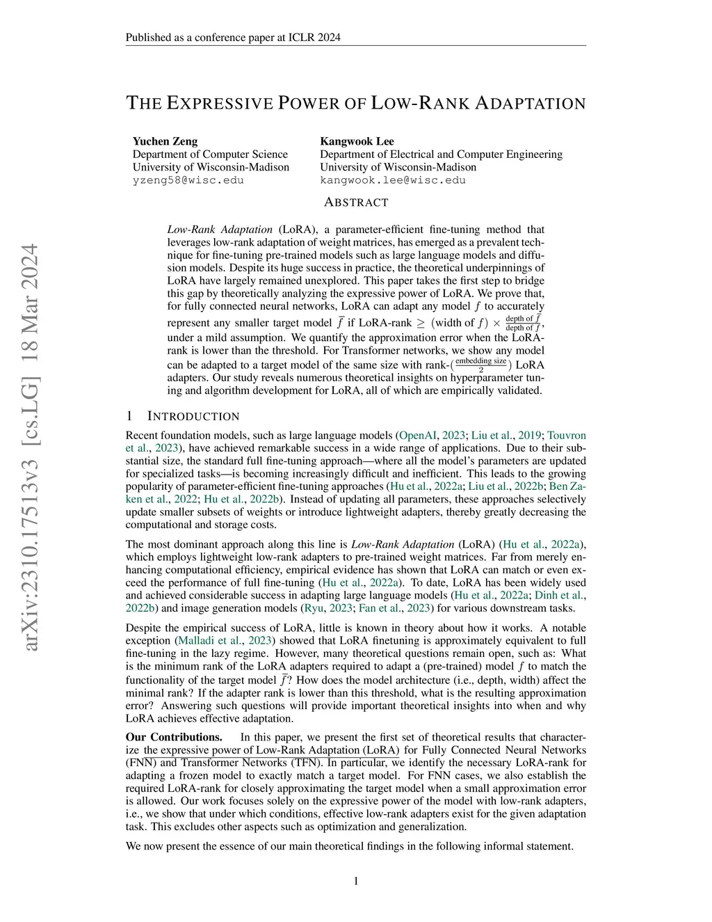 Low-Rank Adaptation (LoRA), a parameter-efficient fine-tuning method that leverages low-rank adaptation of weight matrices, has emerged as a prevalent technique for fine-tuning pre-trained models such as large language models and diffusion models. Despite its huge success in practice, the theoretical underpinnings of LoRA have largely remained unexplored. This paper takes the first step to bridge this gap by theoretically analyzing the expressive power of LoRA. We prove that, for fully connected neural networks, LoRA can adapt any model to accurately represent any smaller target model if LoRA-rank . We also quantify the approximation error when LoRA-rank is lower than the threshold. For Transformer networks, we show any model can be adapted to a target model of the same size with rank- LoRA adapters.